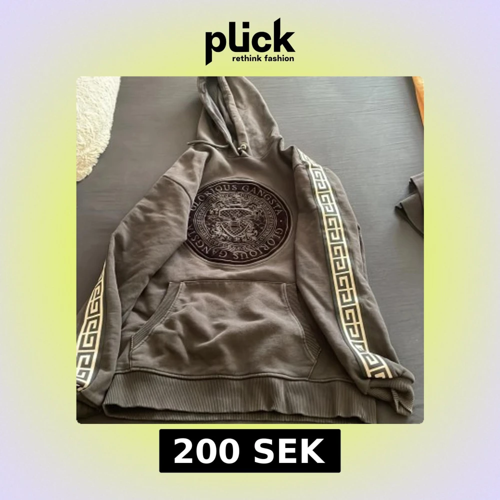 Säljer en grå hoodie från Glorious Gangsta med ett stort tryck på framsidan. Hoodien har en känguruficka och dekorativa band längs ärmarna. Perfekt för en avslappnad stil.