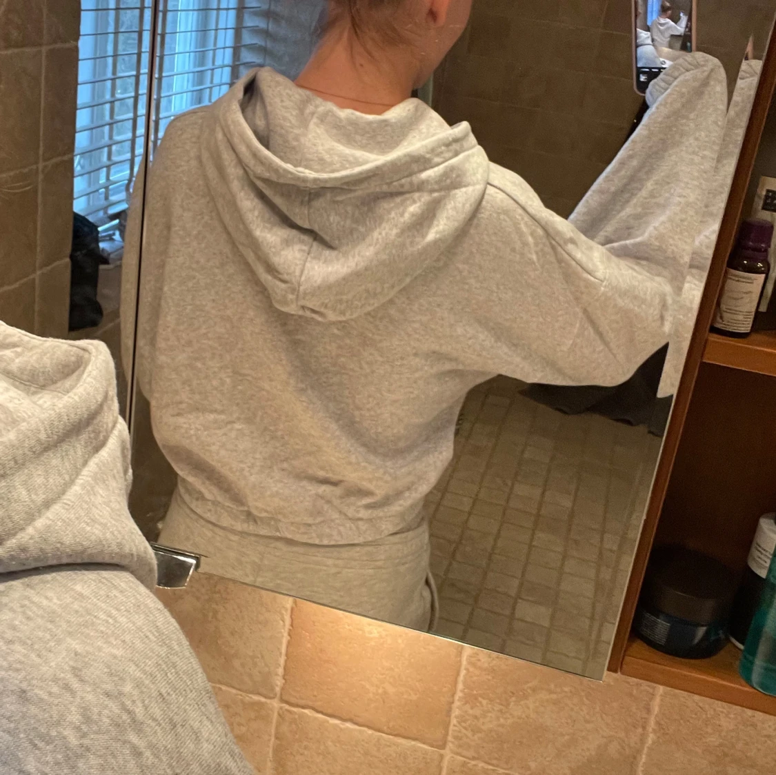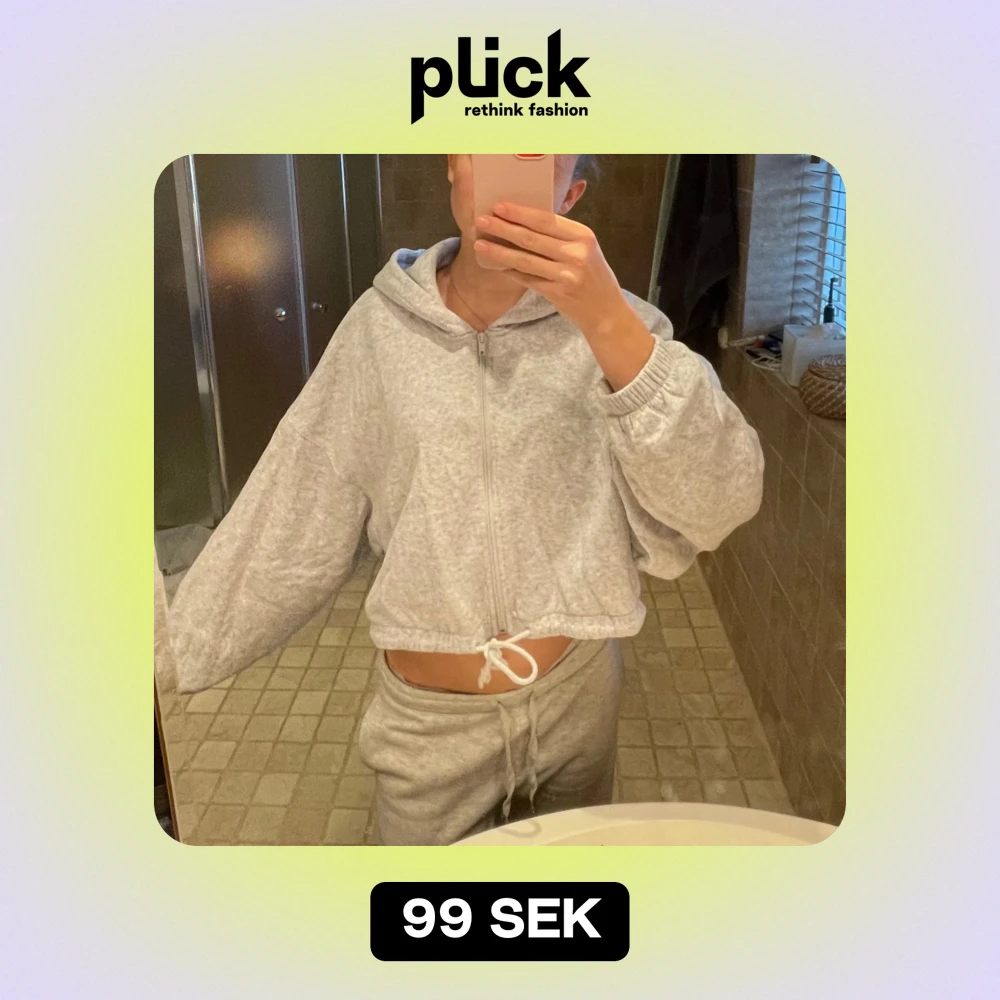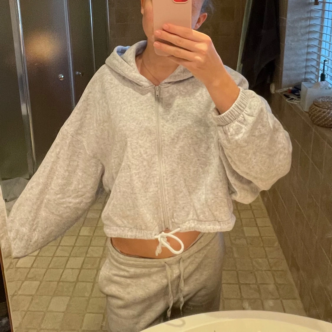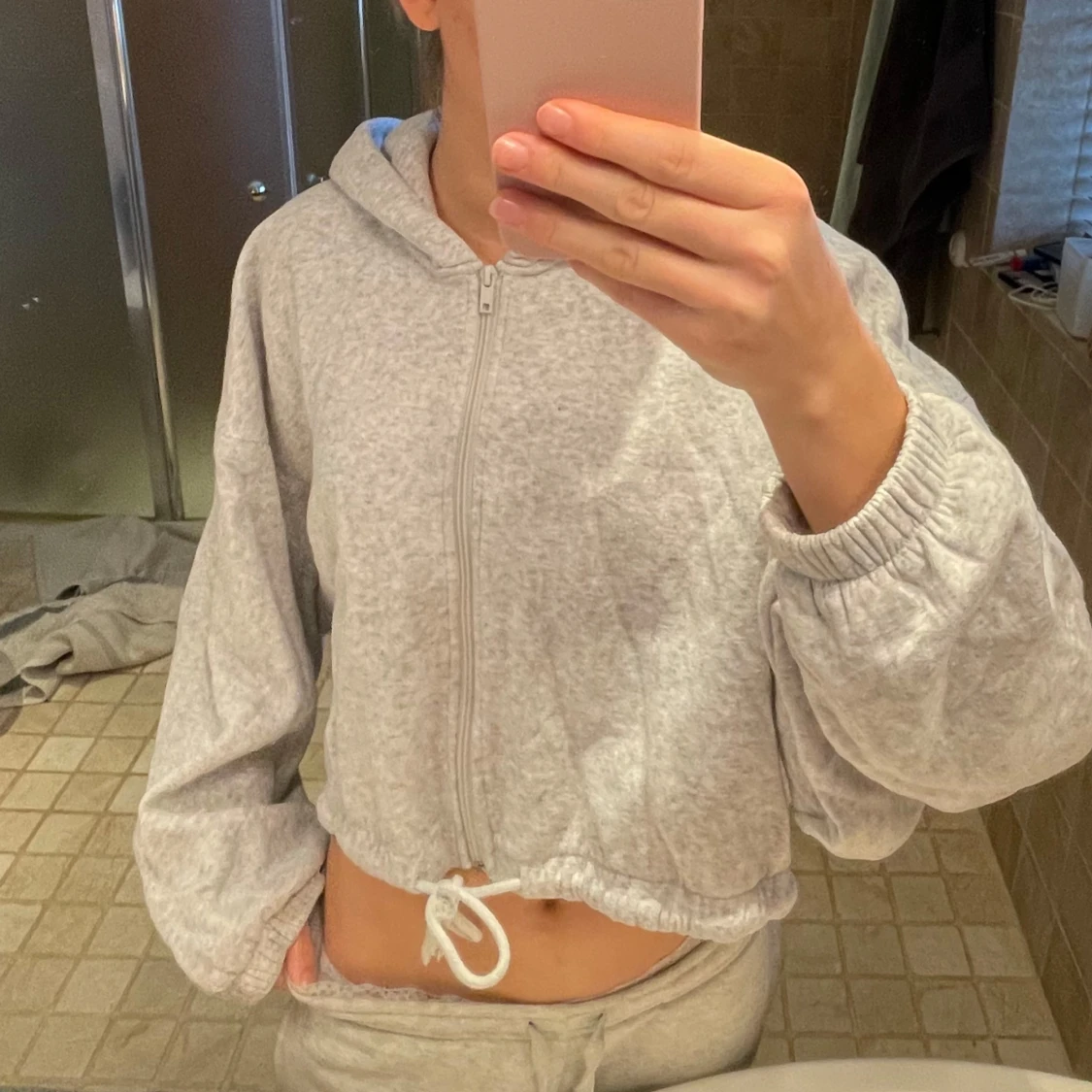 Mysig grå hoodie från H&M i storlek L. Den har en dragkedja framtill och en justerbar dragsko i nederkanten för en perfekt passform. Perfekt för en avslappnad dag hemma i soffan. 🩶