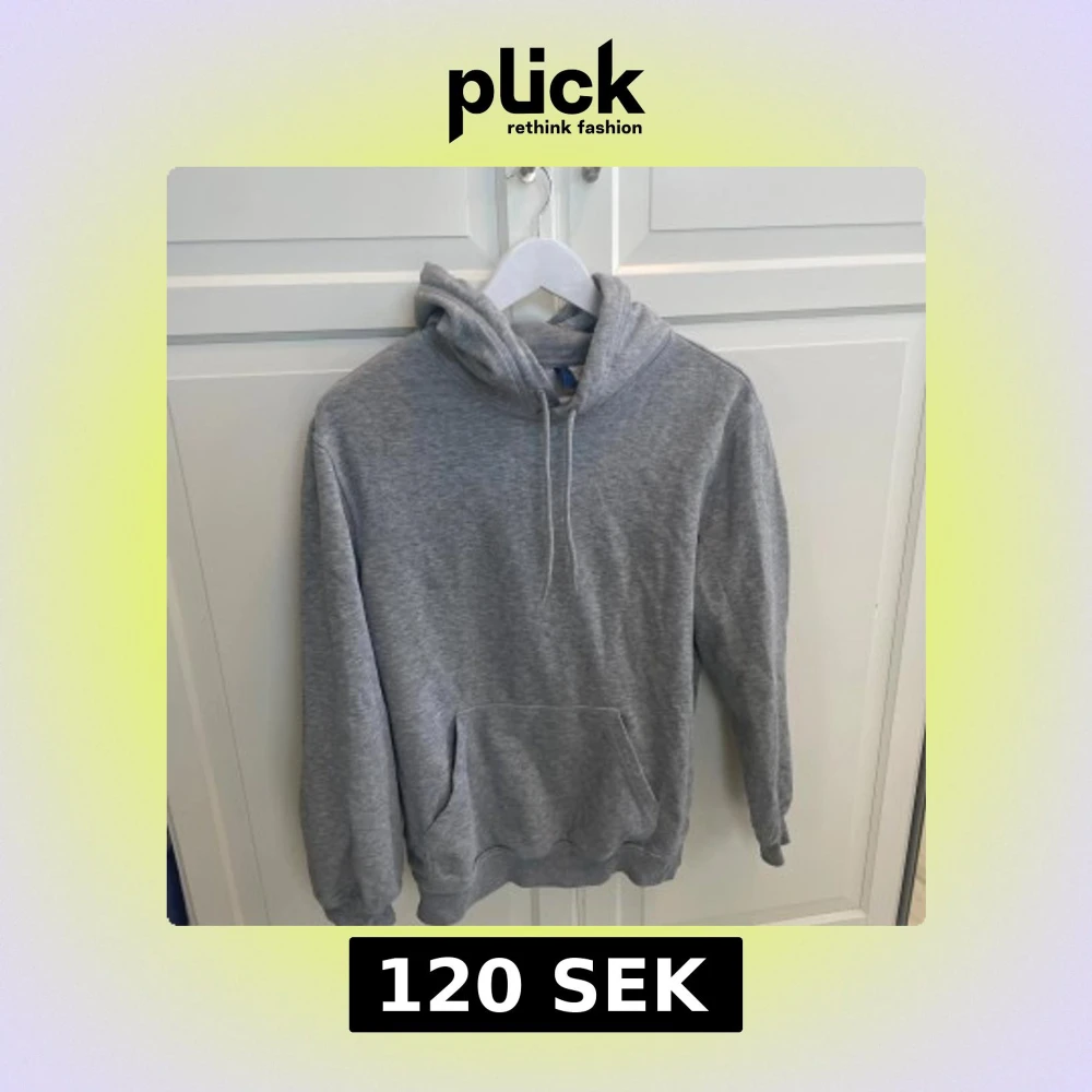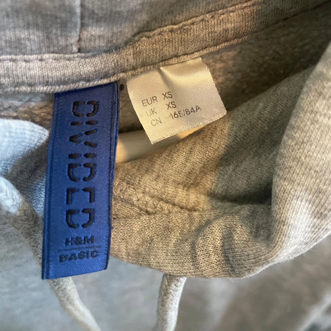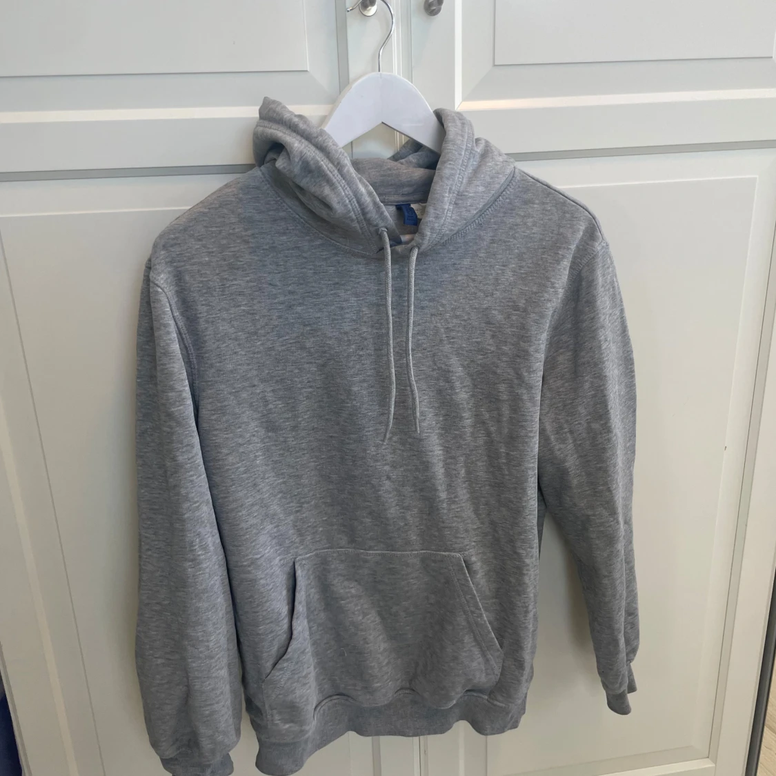En klassisk grå hoodie från H&M Divided i storlek XS. Tröjan har huva med snörning, stor känguruficka framtill och ribbade muddar vid ärmslut och nederkant. Perfekt för chill dagar eller när du vill ha en enkel och stilren look.