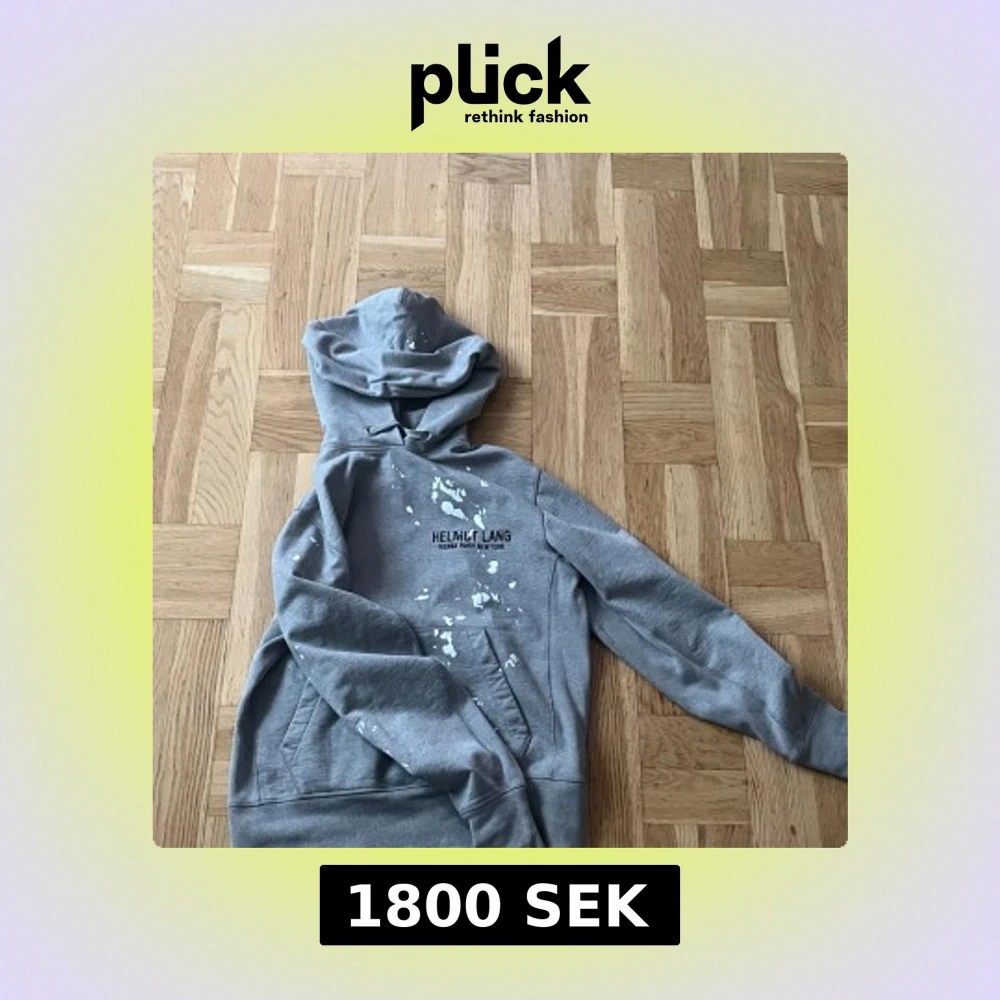 Säljer en grå hoodie från Helmut Lang med vit färgfläck-design och tryck både fram och bak. Tröjan har huva, magficka och en avslappnad passform. Perfekt för dig som gillar streetwear och vill sticka ut lite extra. Storlek M
