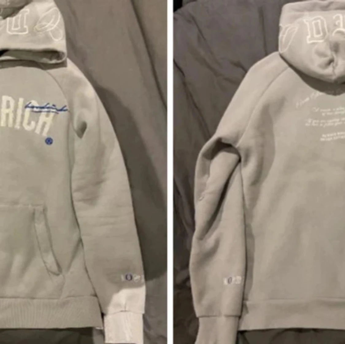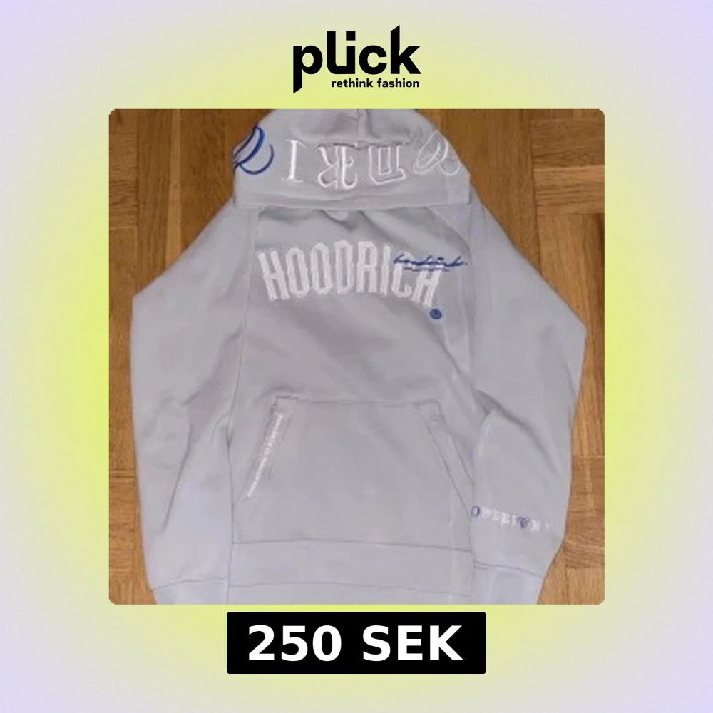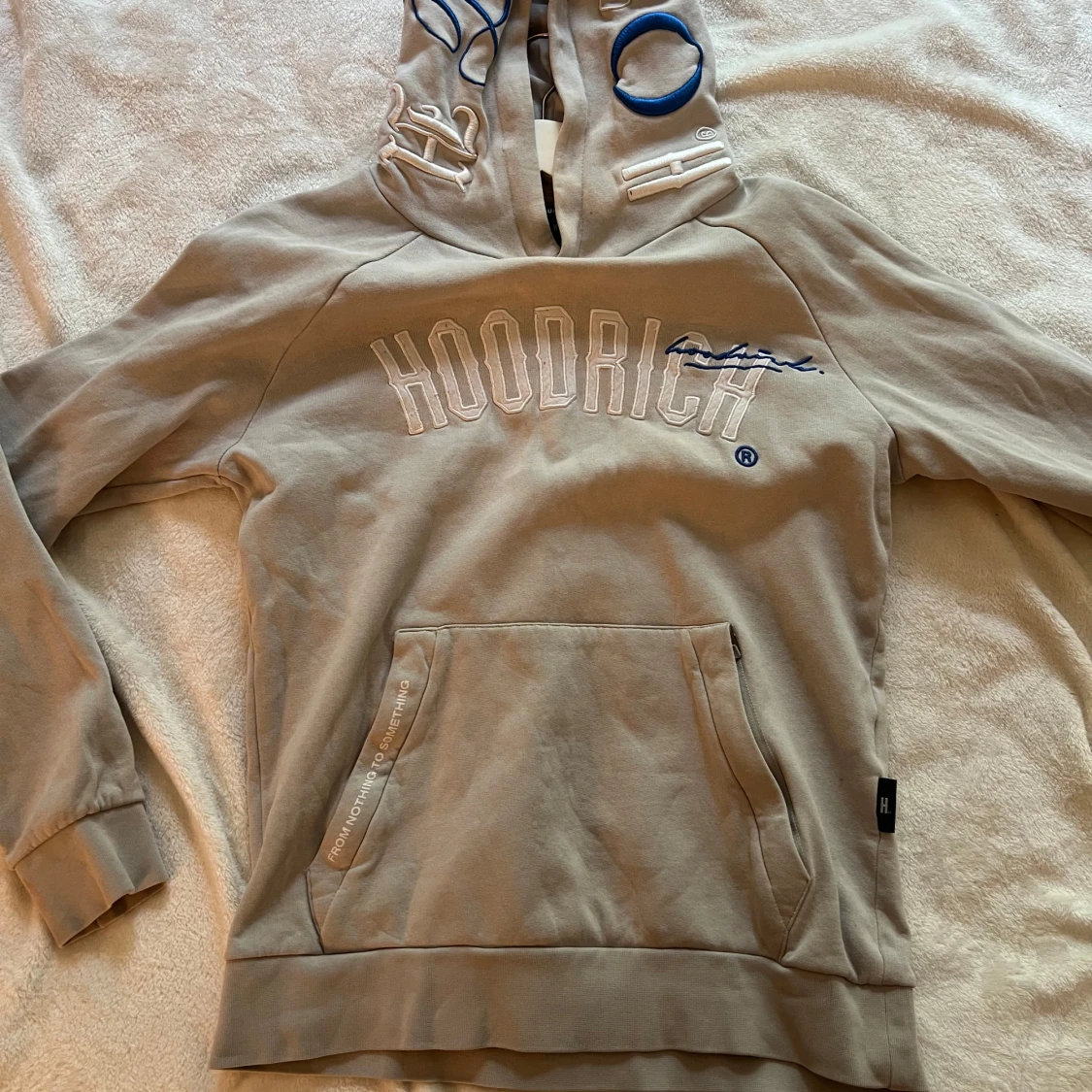 Säljer en grå hoodie från Hoodrich med vit broderad logga och blå detaljer på bröstet och luvan. Tröjan har magficka och ribbade muddar vid ärmslut och nederkant. Perfekt för en avslappnad stil.