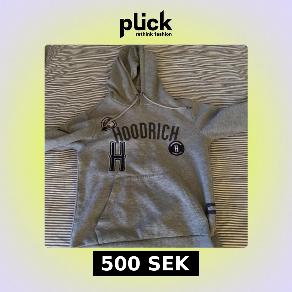 Säljer en grå hoodie från Hoodrich med tryck på framsidan. Den har en stor ficka framtill och justerbar huva med dragsko. Perfekt för en avslappnad stil.