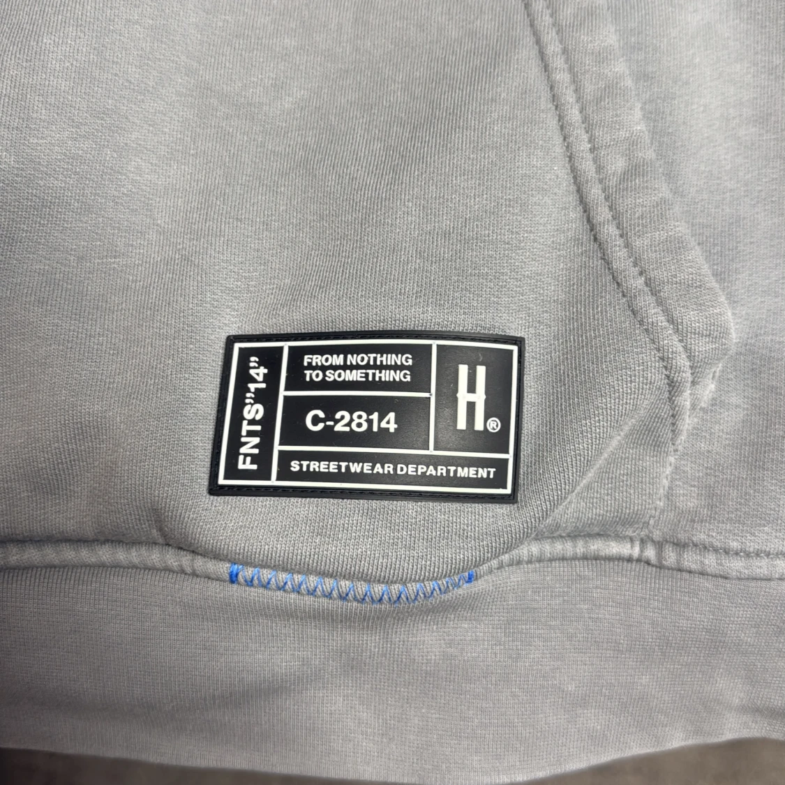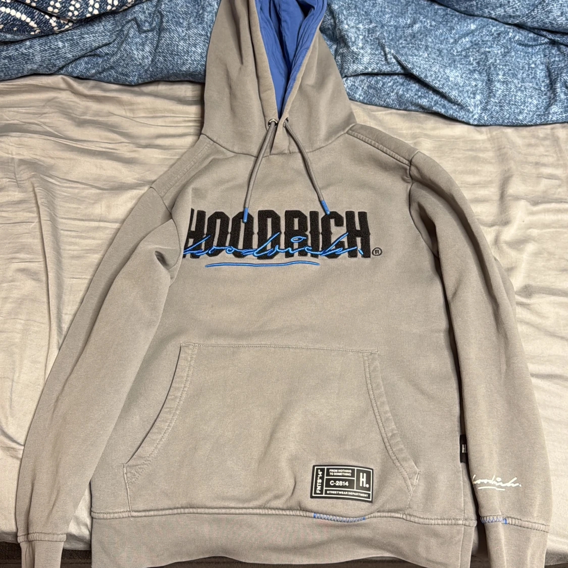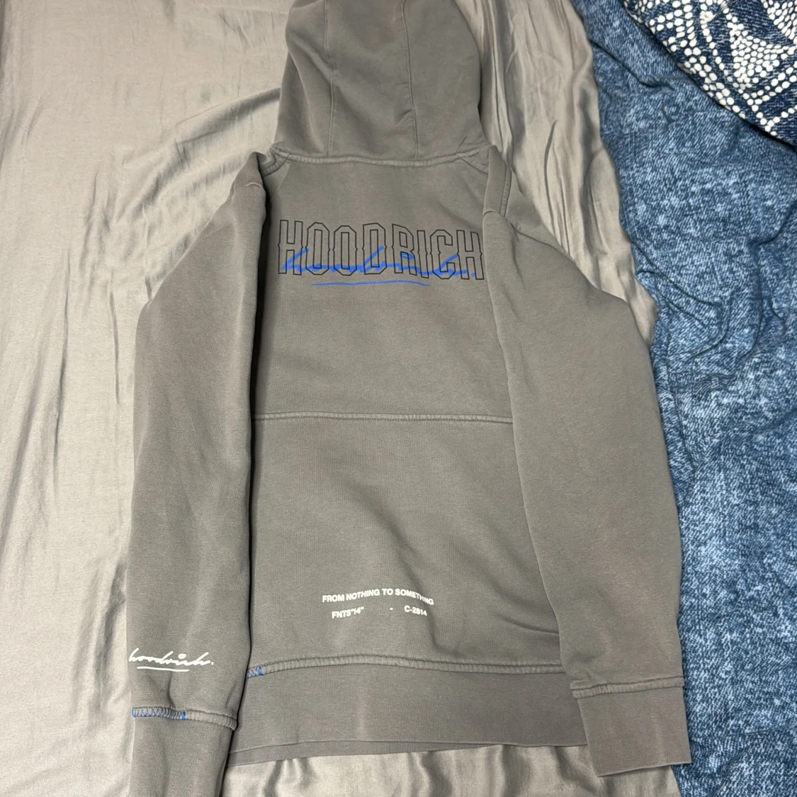 Säljer en grå hoodie från Hoodrich i storlek XS. Tröjan har blått foder i huvan, broderad logga i svart och blått framtill, samt känguruficka och coola streetwear-detaljer. Perfekt för dig som gillar urban stil och snygga loggor.