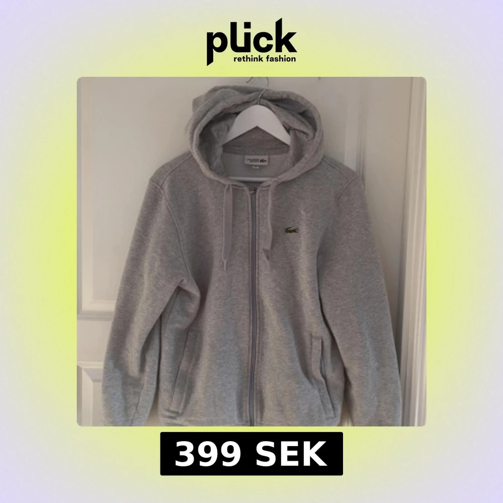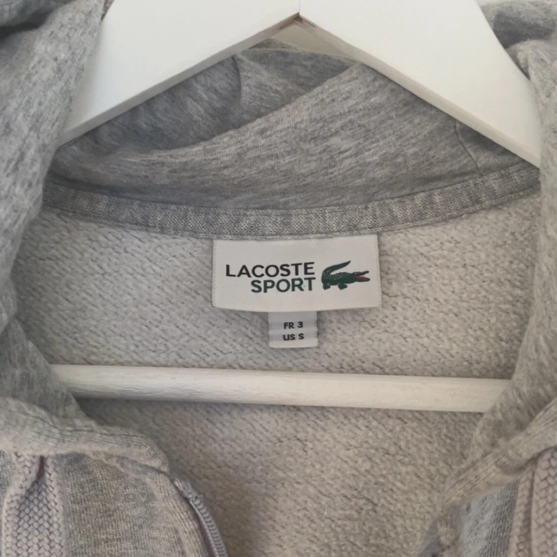Säljer en grå hoodie från Lacoste Sport med dragkedja och huva. Tröjan har snörning i huvan, två fickor framtill och den klassiska gröna krokodilloggan på bröstet. Perfekt för chill dagar eller när du vill ha en sportig look.