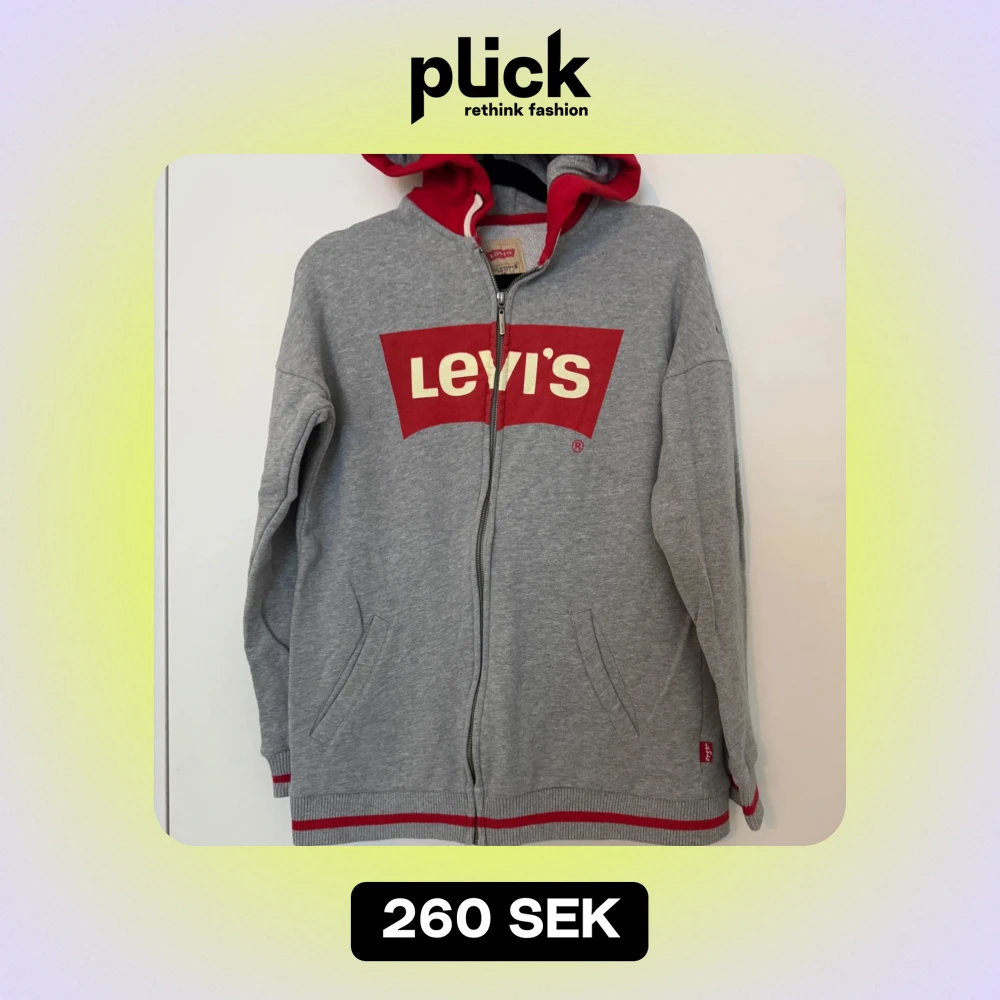 Säljer en snygg grå hoodie från Levi's med röd insida i huvan och stort rött Levi's-tryck på bröstet. Den har en dragkedja framtill och praktiska fickor. Perfekt för en avslappnad stil och passar bra till både höst och vår.
