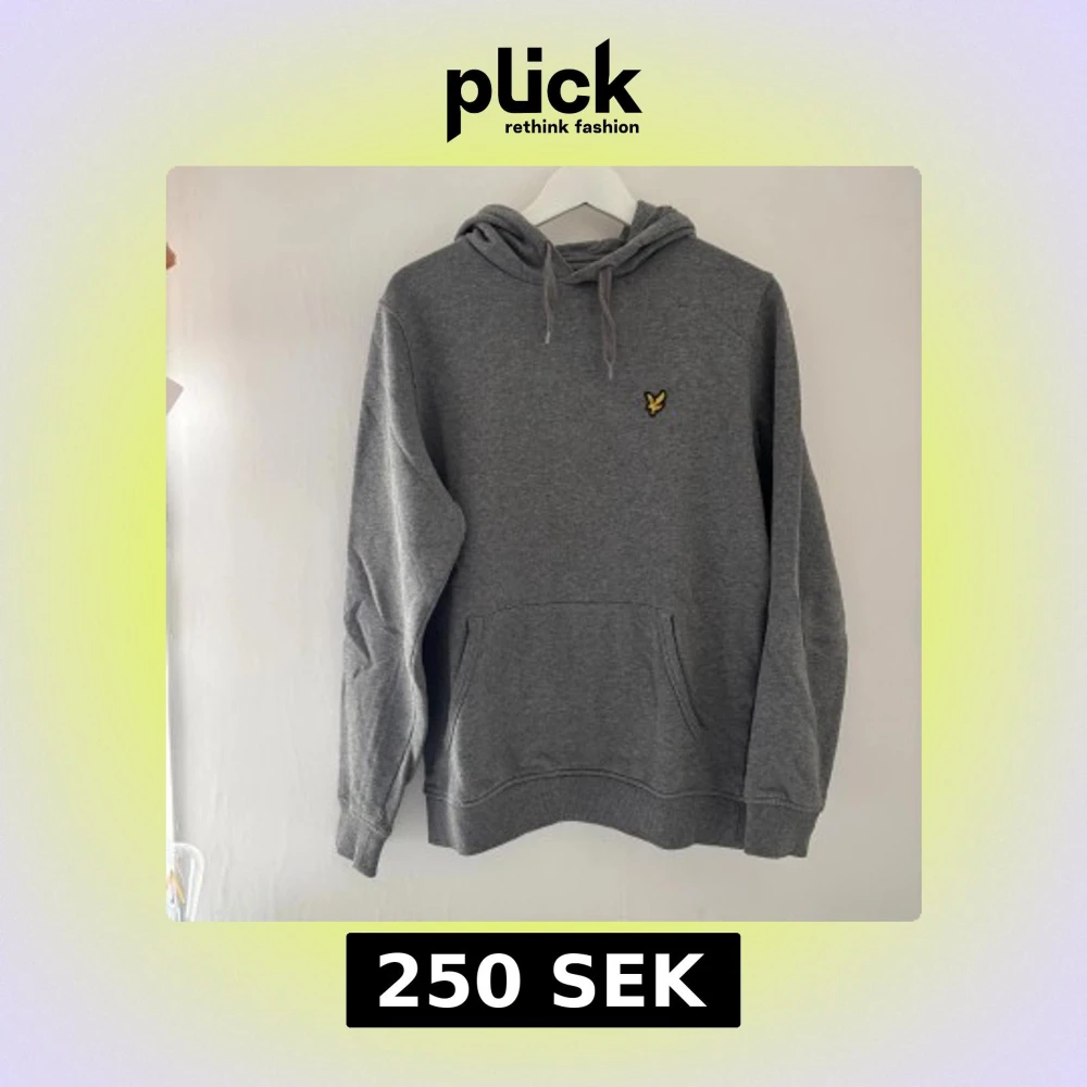 Säljer en grå hoodie från Lyle & Scott med klassisk gul fågel-logga på bröstet. Tröjan har huva med snörning, magficka och ribbade muddar. Perfekt för chill dagar och enkel att matcha med jeans eller joggers.
