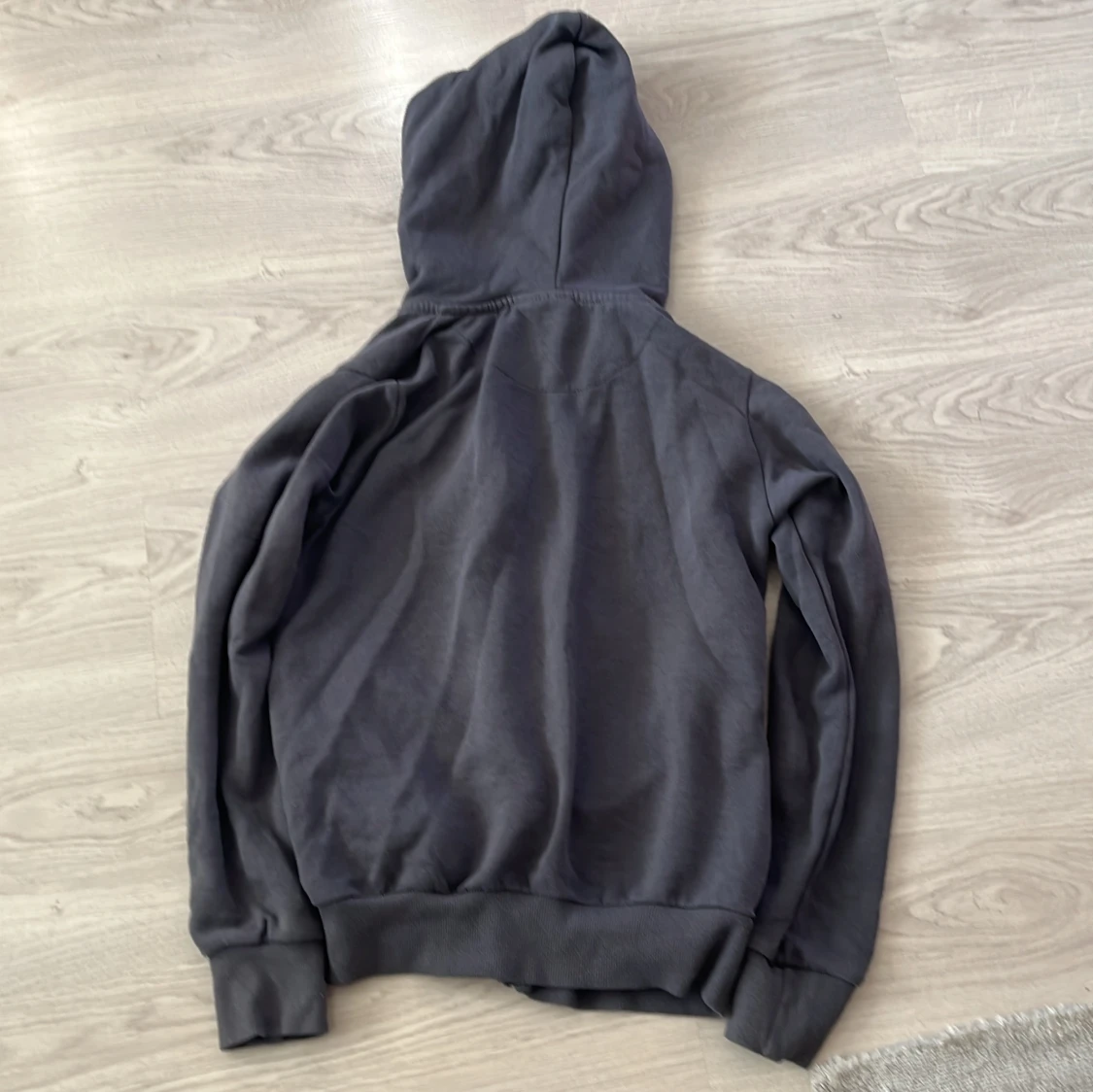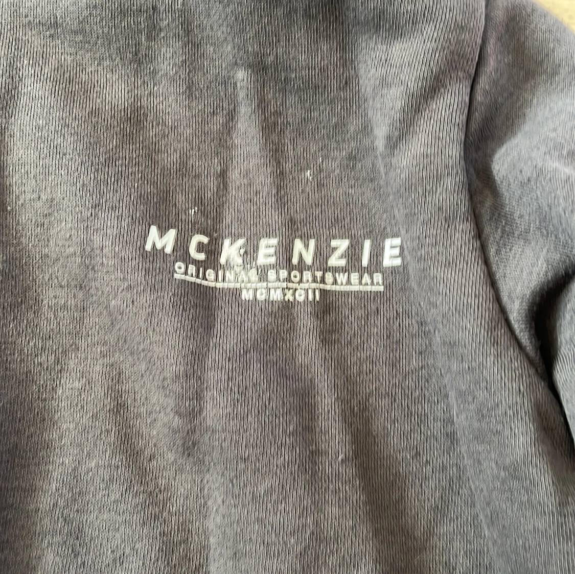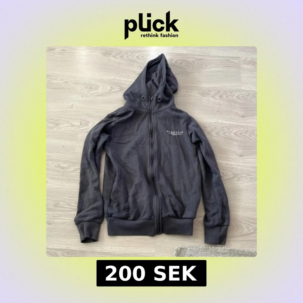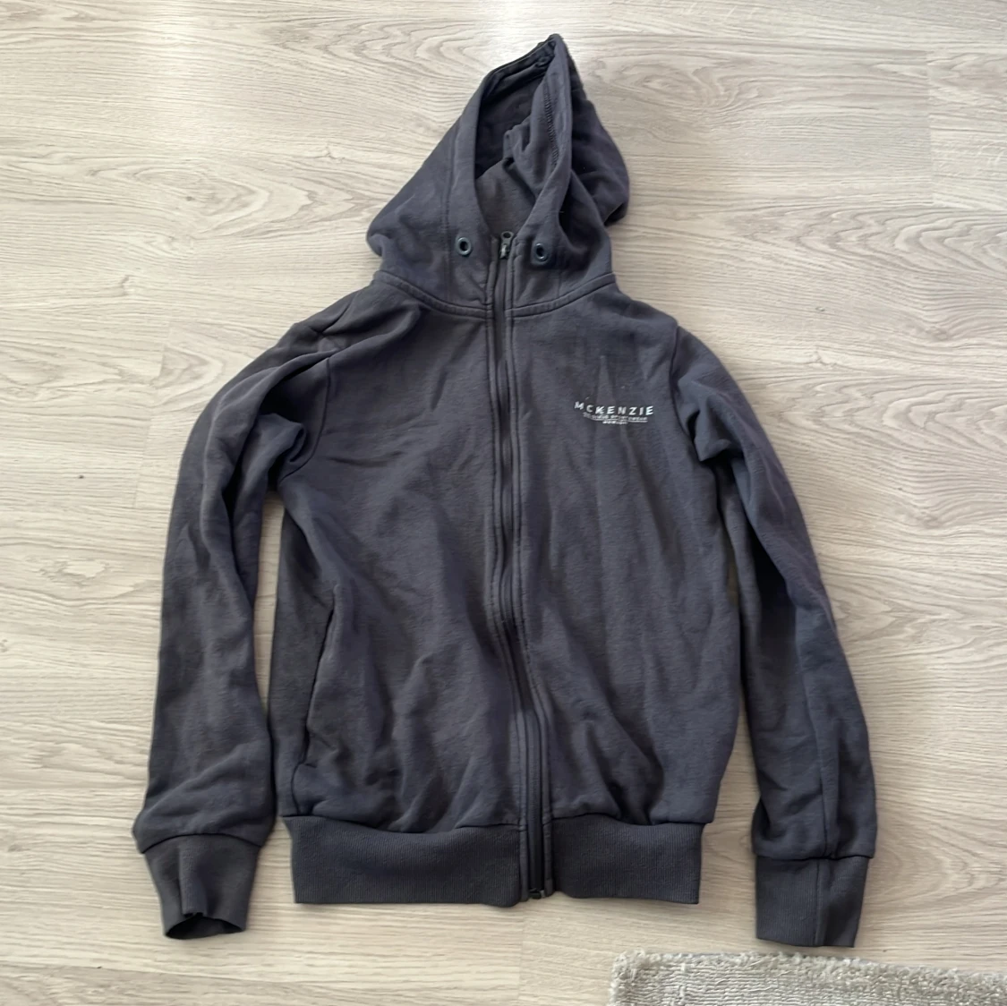 Säljer en stilren grå hoodie från McKenzie med dragkedja och justerbar huva. Perfekt för en avslappnad look. Den har långa ärmar och ribbade muddar för extra komfort. Passar bra till både jeans och joggers.