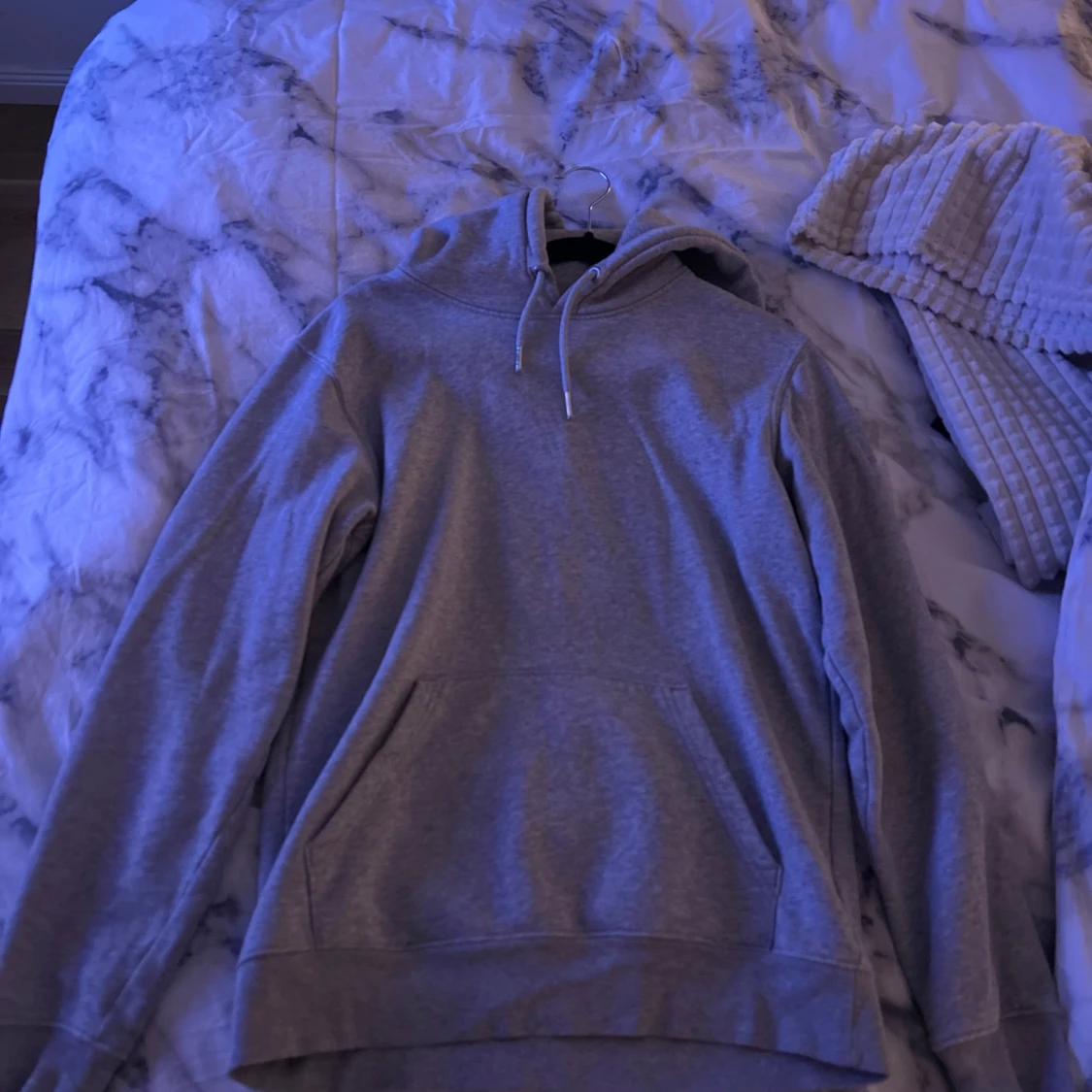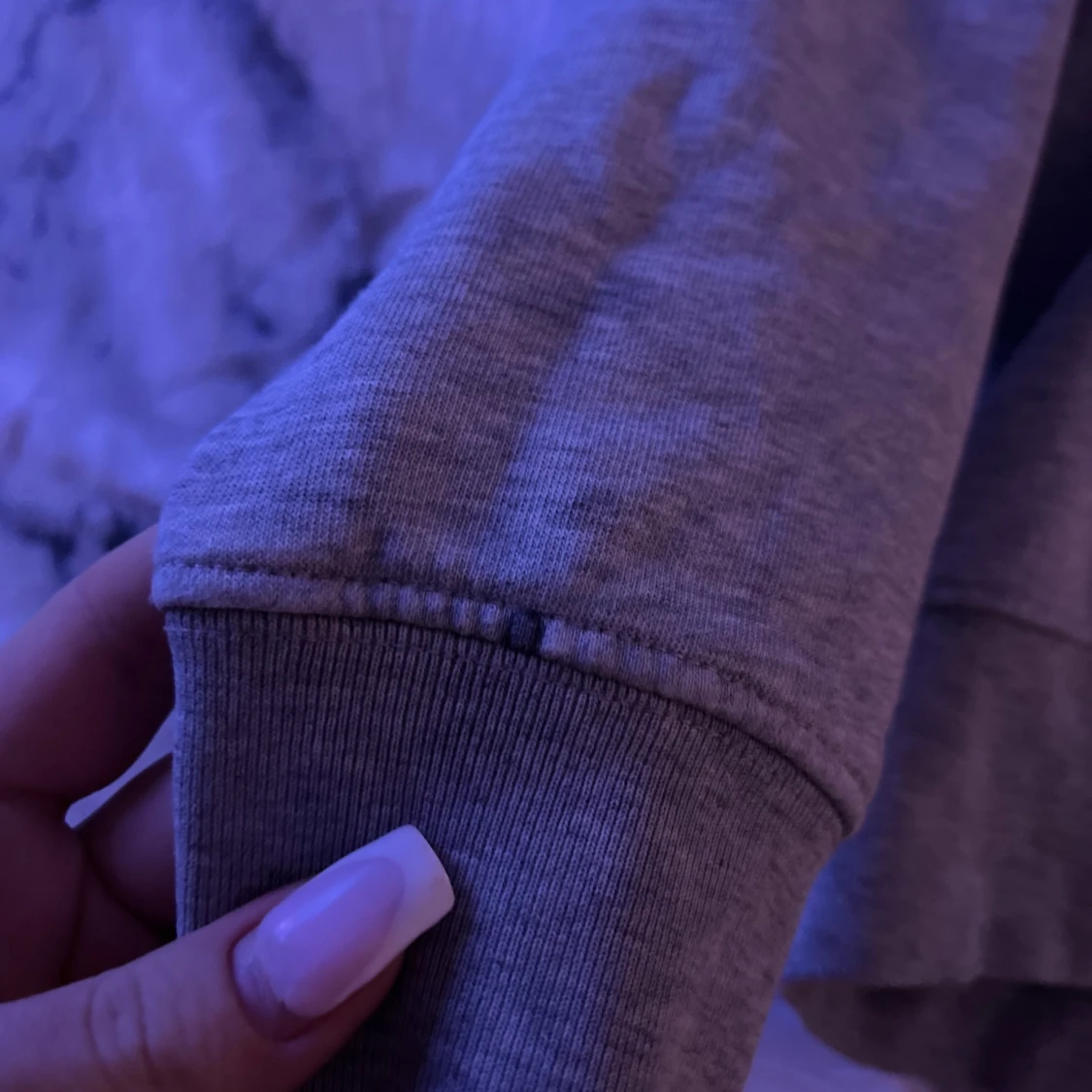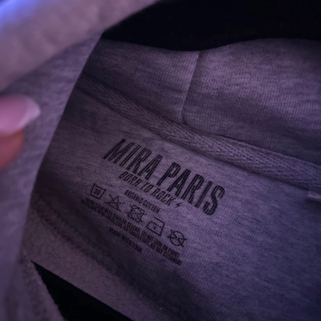 Säljer en grå hoodie från Mira Paris med texten 'Mi Amor' och ett pilmotiv på ryggen. Tröjan har en klassisk design med långa ärmar och en bekväm huva. Perfekt för en avslappnad stil. Finns en liten defekt som är svart vid höger sida arm.
