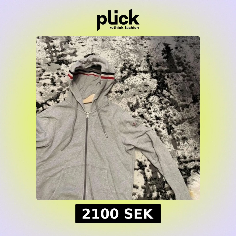 Säljer en stilren grå hoodie från Moncler med dragkedja och huva. Tröjan har Moncler-logga på ärmen och randiga detaljer i rött, vitt och svart på huvan och ärmsluten. Perfekt för en avslappnad look.