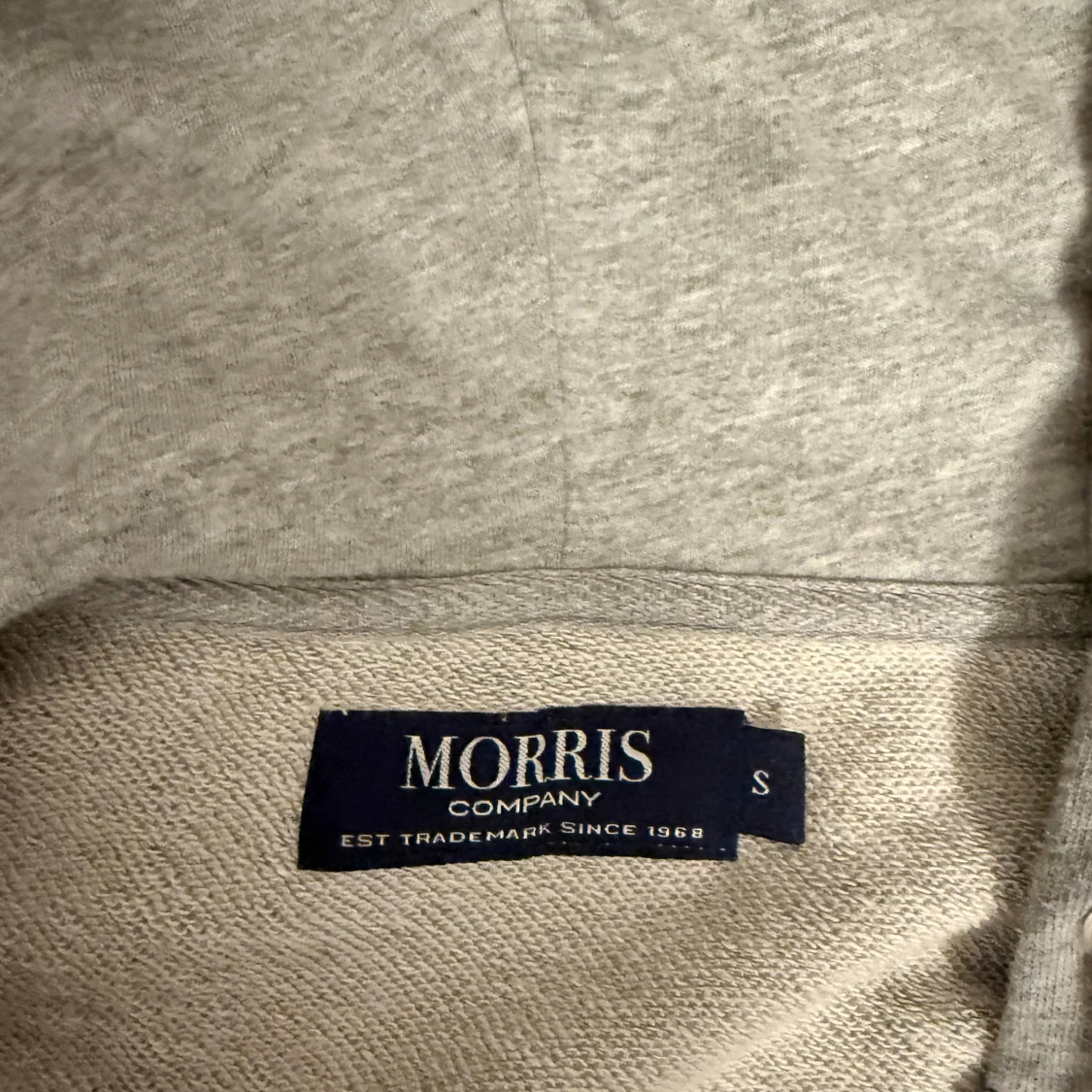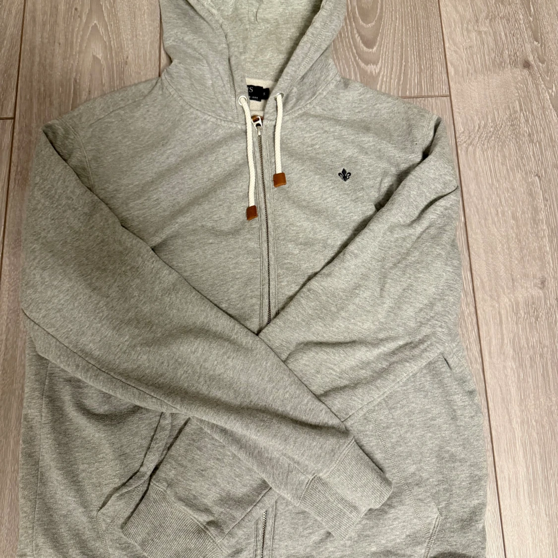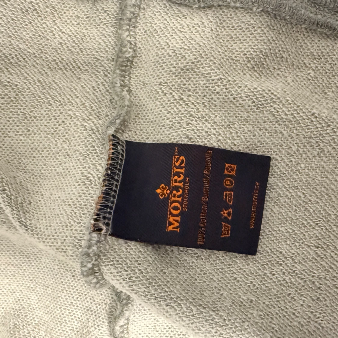 Säljer en ljusgrå hoodie från Morris med dragkedja och huva. Tröjan har vita snören med bruna detaljer, ribbade muddar och en liten broderad logga på bröstet. Perfekt för chill dagar och enkel att matcha med jeans eller joggers.