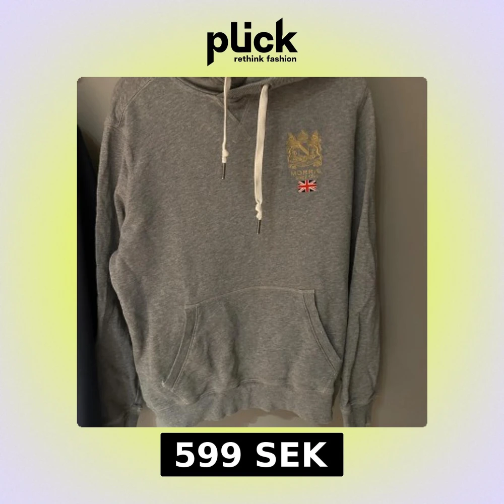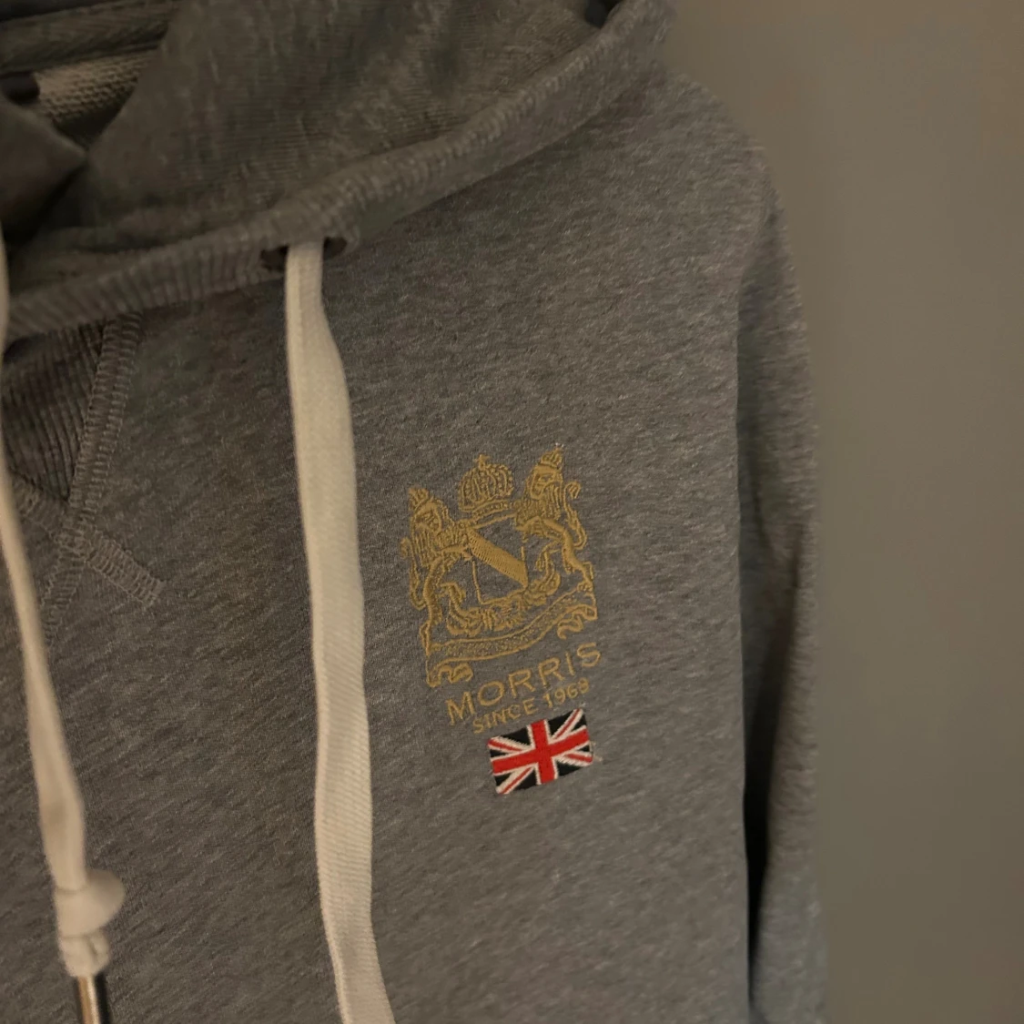 Grå hoodie från Morris med guldfärgat emblem och brittisk flagga broderat på bröstet. Tröjan har vit snörning i huvan och en stor magficka framtill. Mjuk bomullskänsla och klassisk passform, perfekt för chill dagar.