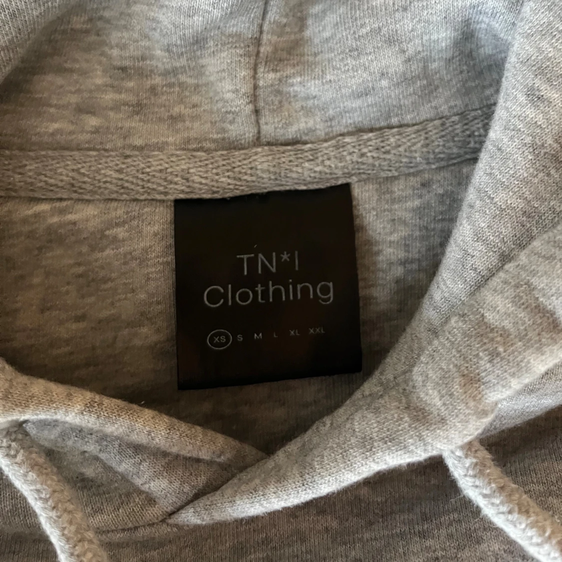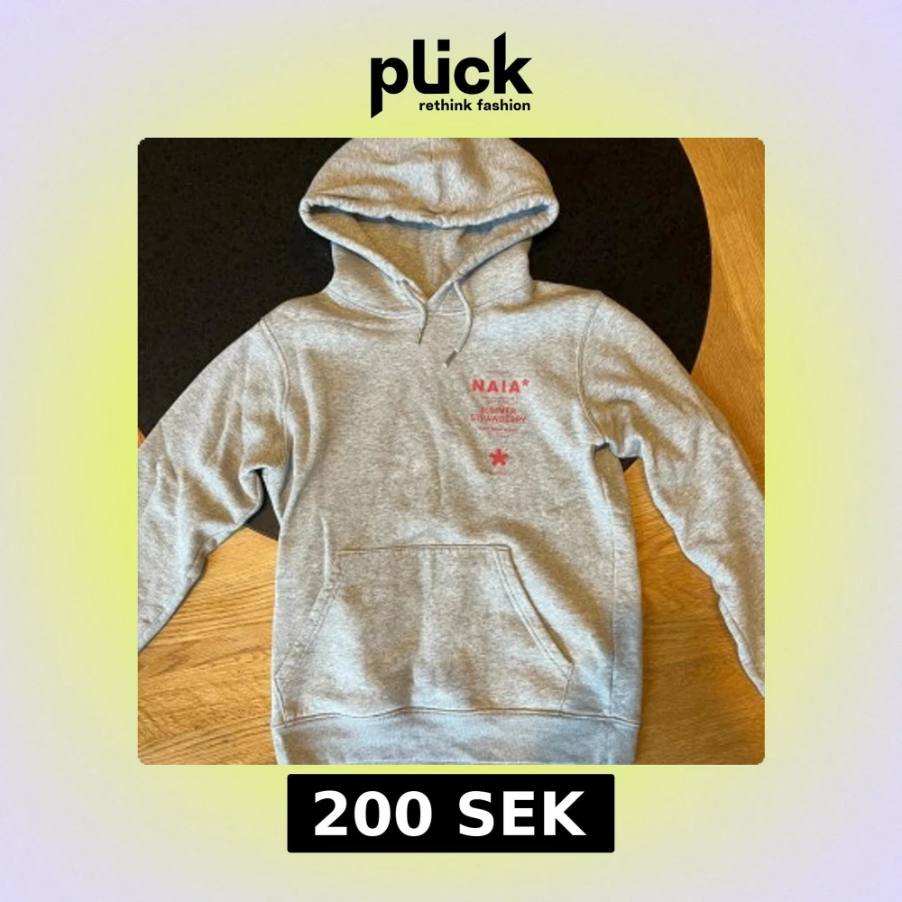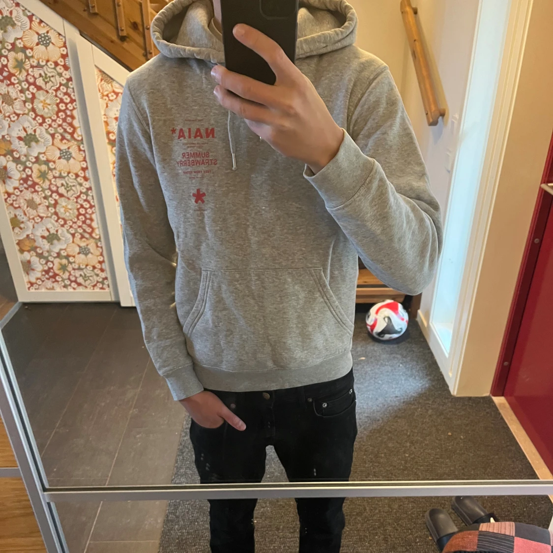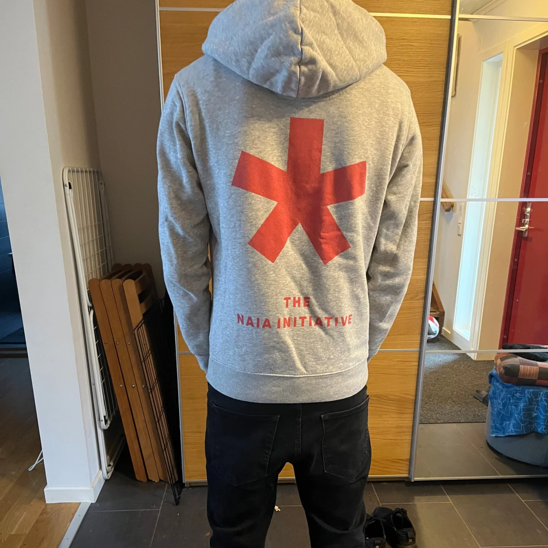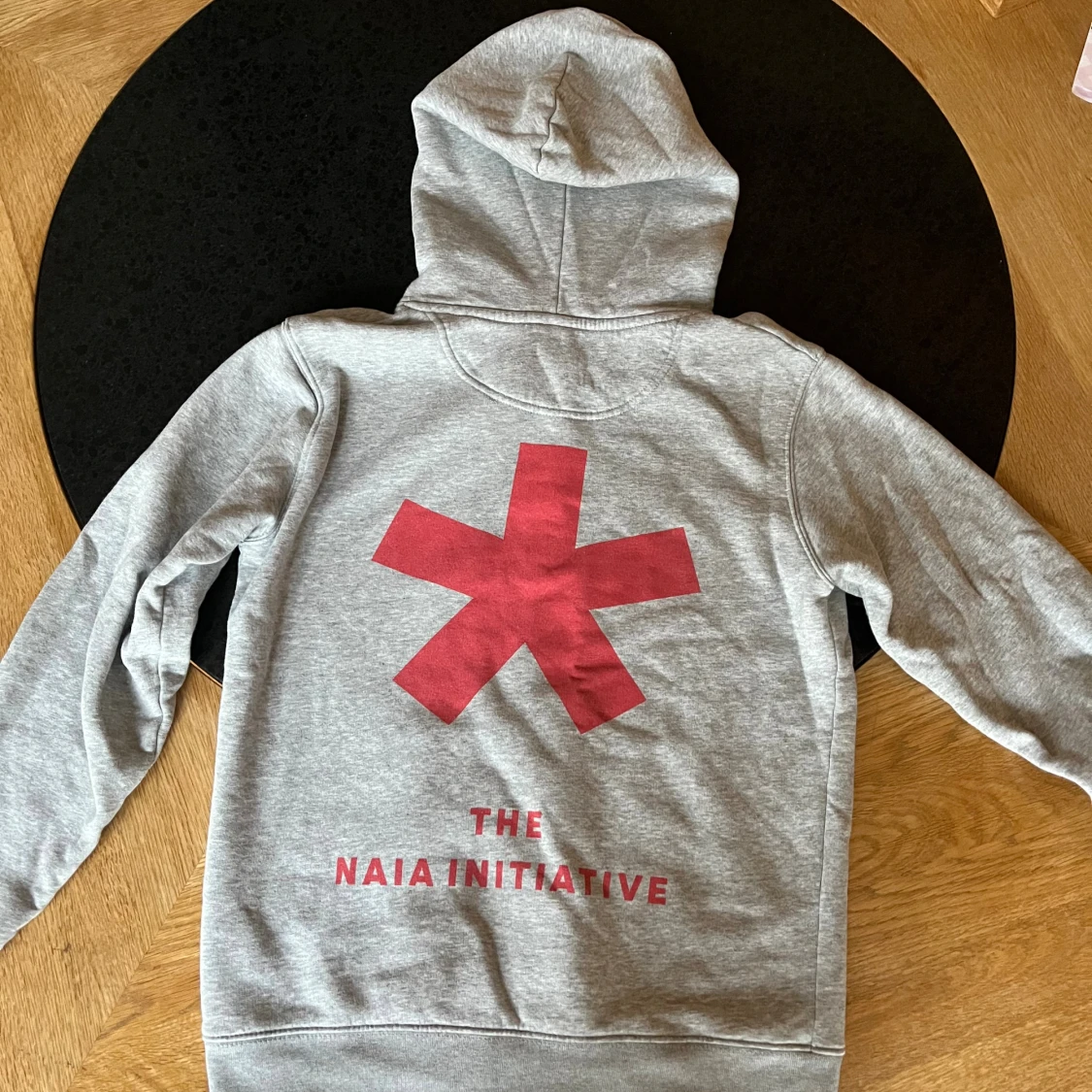 Grå hoodie med stor röd stjärna och texten 'THE NAIA INITIATIVE' på ryggen. Framsidan har tryck med NAIA och Summer Strawberry i rött. Tröjan har huva med snörning och en stor magficka. Perfekt för chill dagar och streetwear vibes.