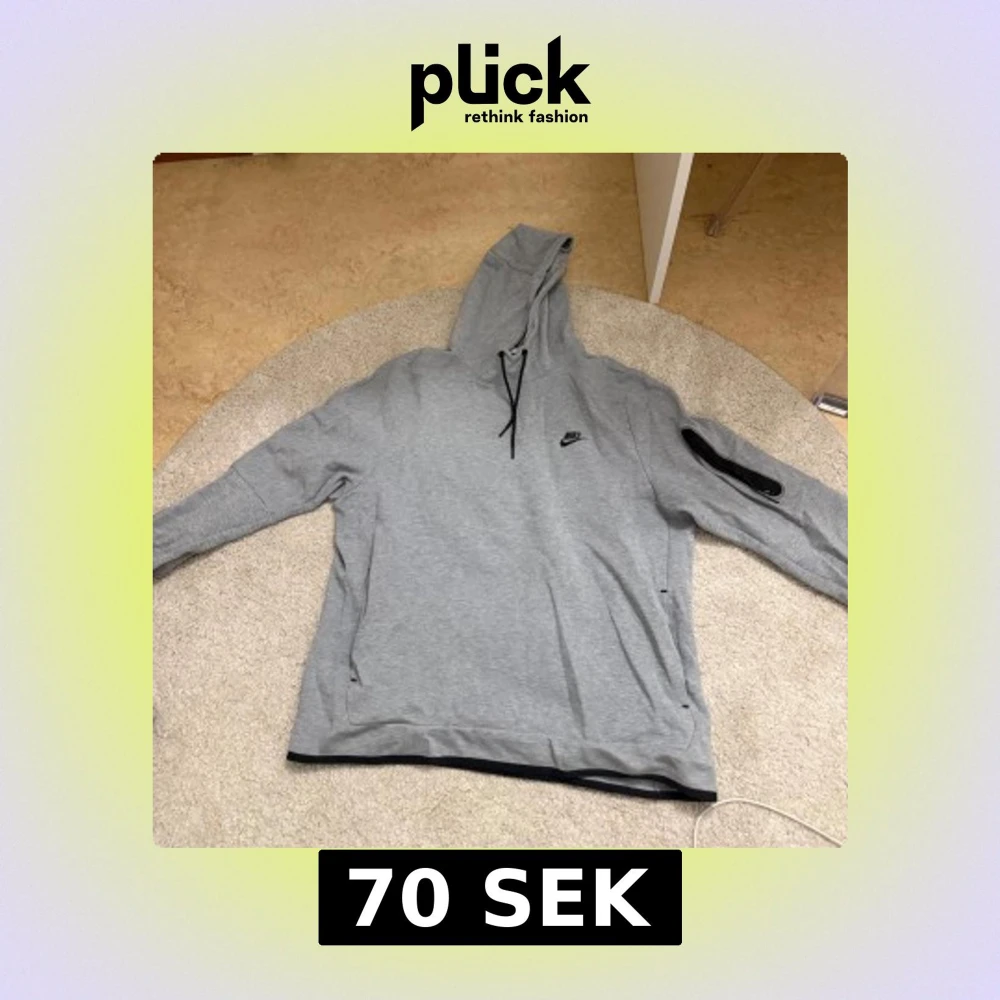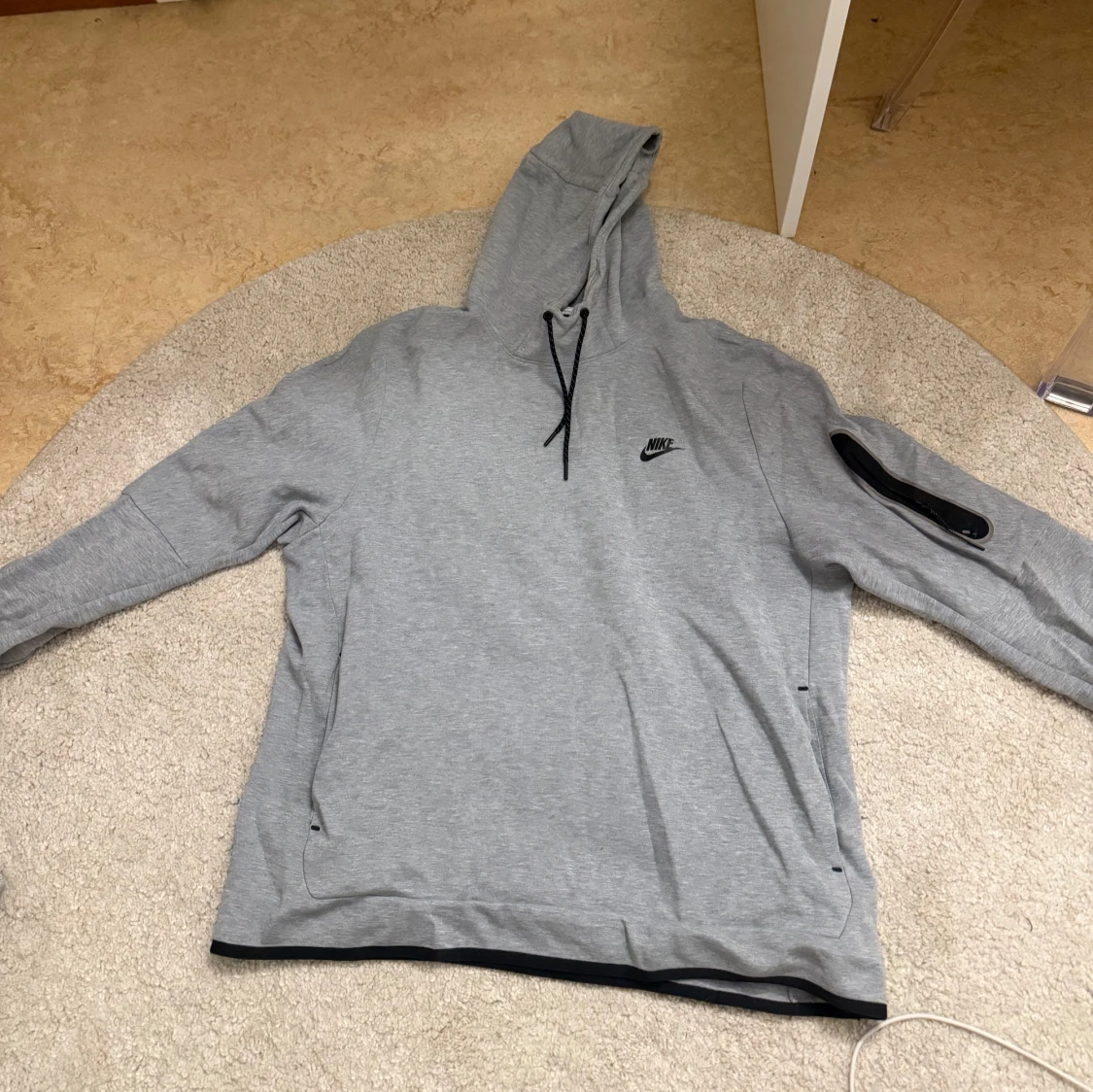 Säljer en grå hoodie från Nike med svart logga på bröstet. Tröjan har en praktisk dragkedja på ärmen och justerbar huva med snören. Perfekt för en avslappnad stil.