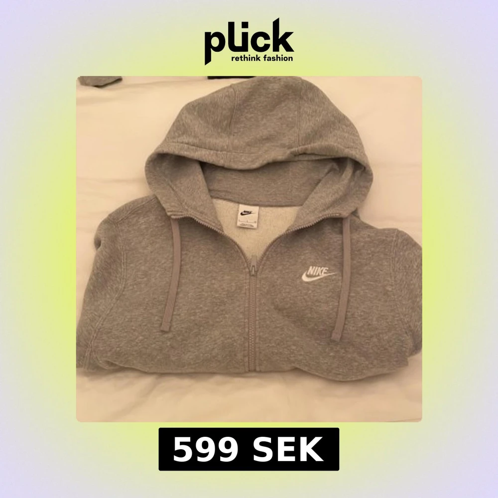 Säljer en grå hoodie från Nike med dragkedja och huva. Tröjan har en mjuk insida och praktiska fickor framtill. Perfekt för en avslappnad stil.