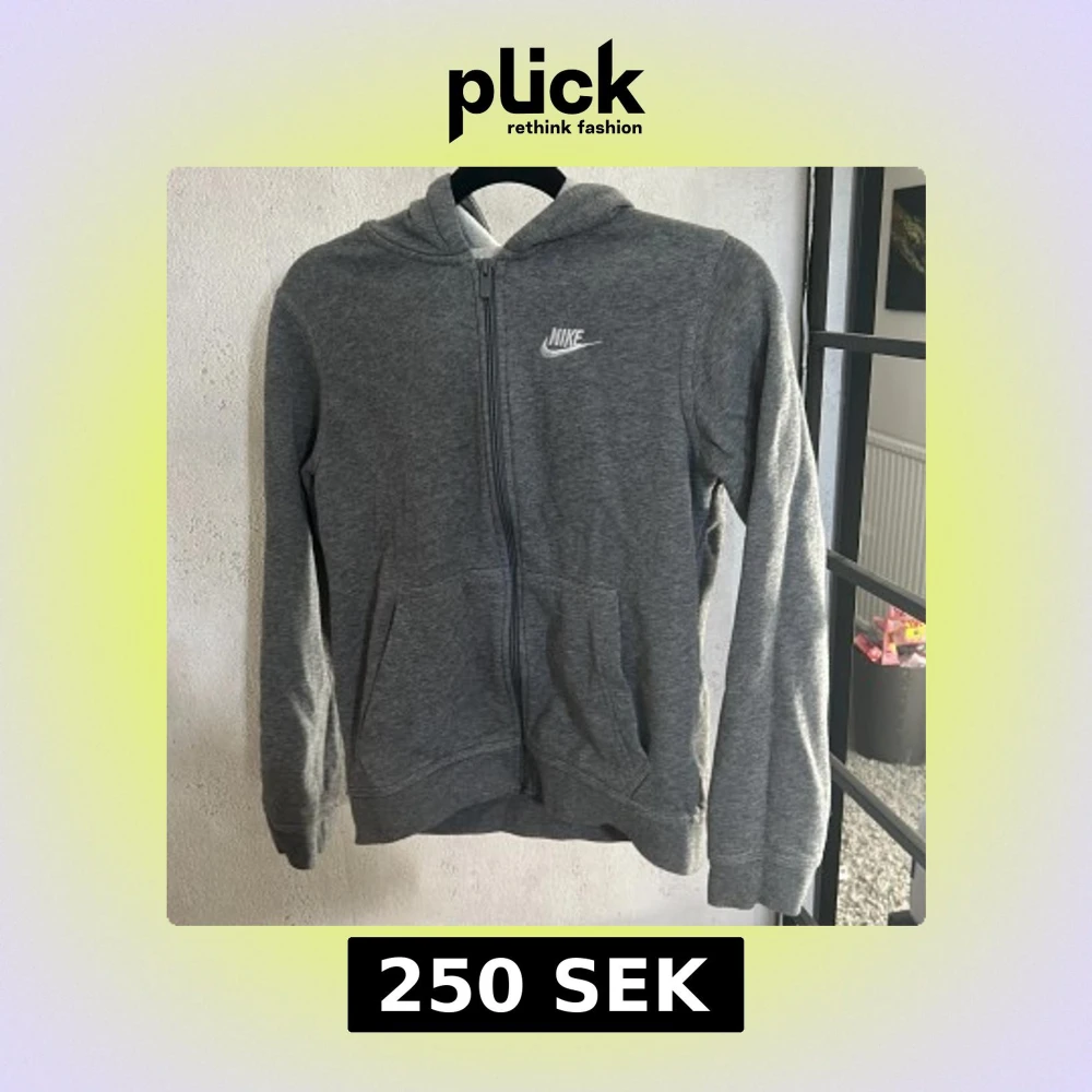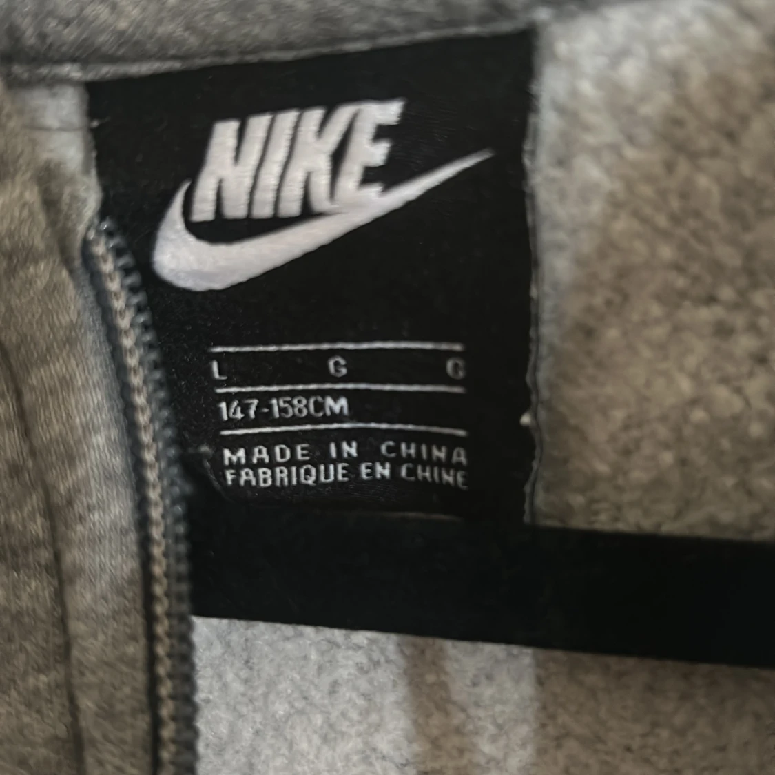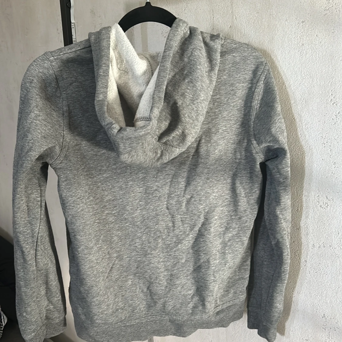 Säljer en grå hoodie från Nike med dragkedja och huva. Tröjan har långa ärmar och en liten vit Nike-logga på bröstet. Perfekt för en avslappnad stil.