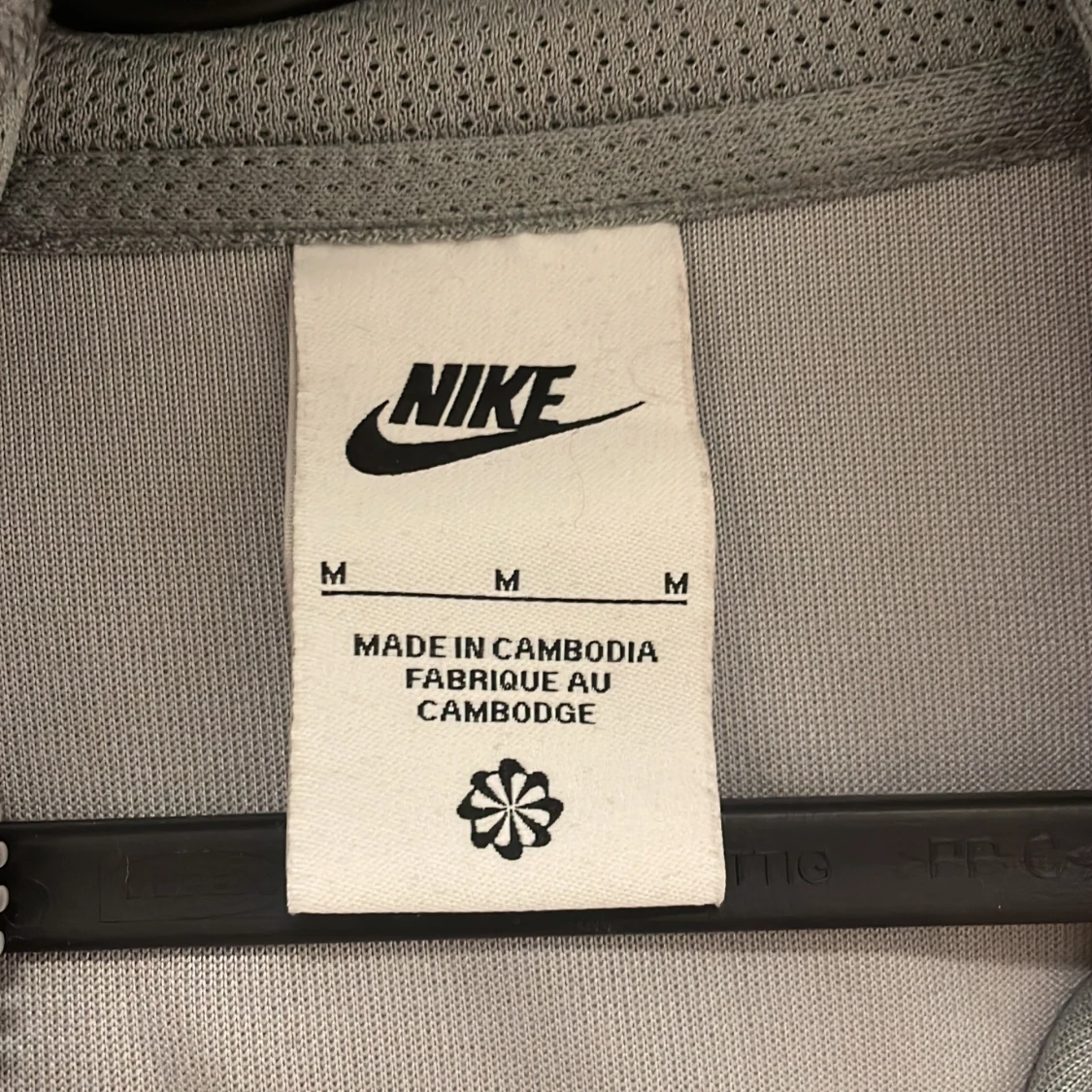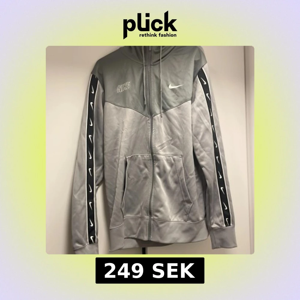 Säljer en grå hoodie från Nike med dragkedja och huva. Jackan har svarta detaljer längs ärmarna med vita Nike-loggor. Perfekt för en sportig look.