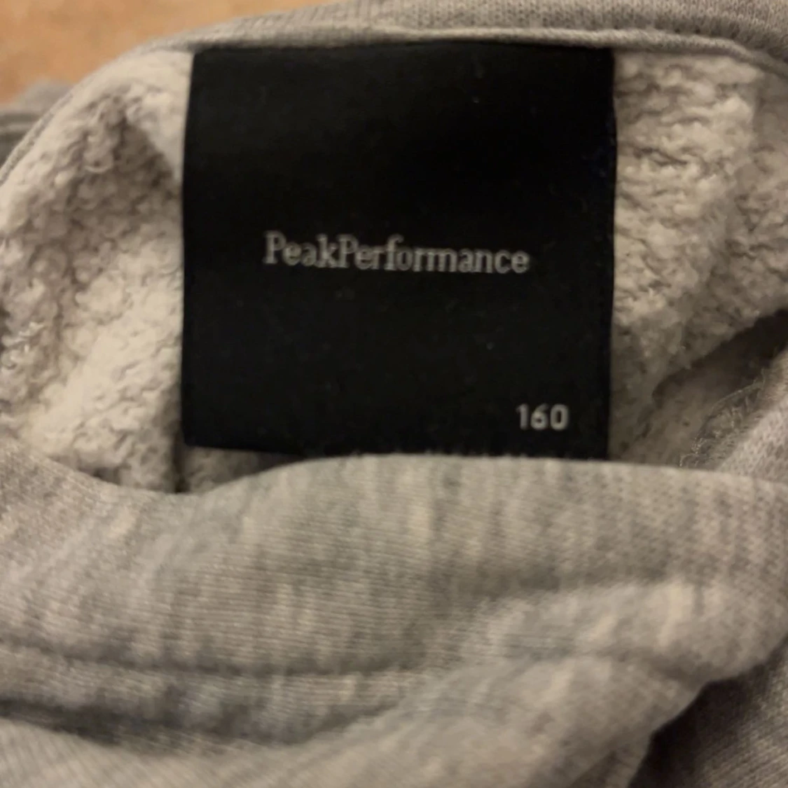 Säljer en grå hoodie från Peak Performance med svart text på bröstet. Den har en klassisk design med huva och långa ärmar. Perfekt för en avslappnad stil.