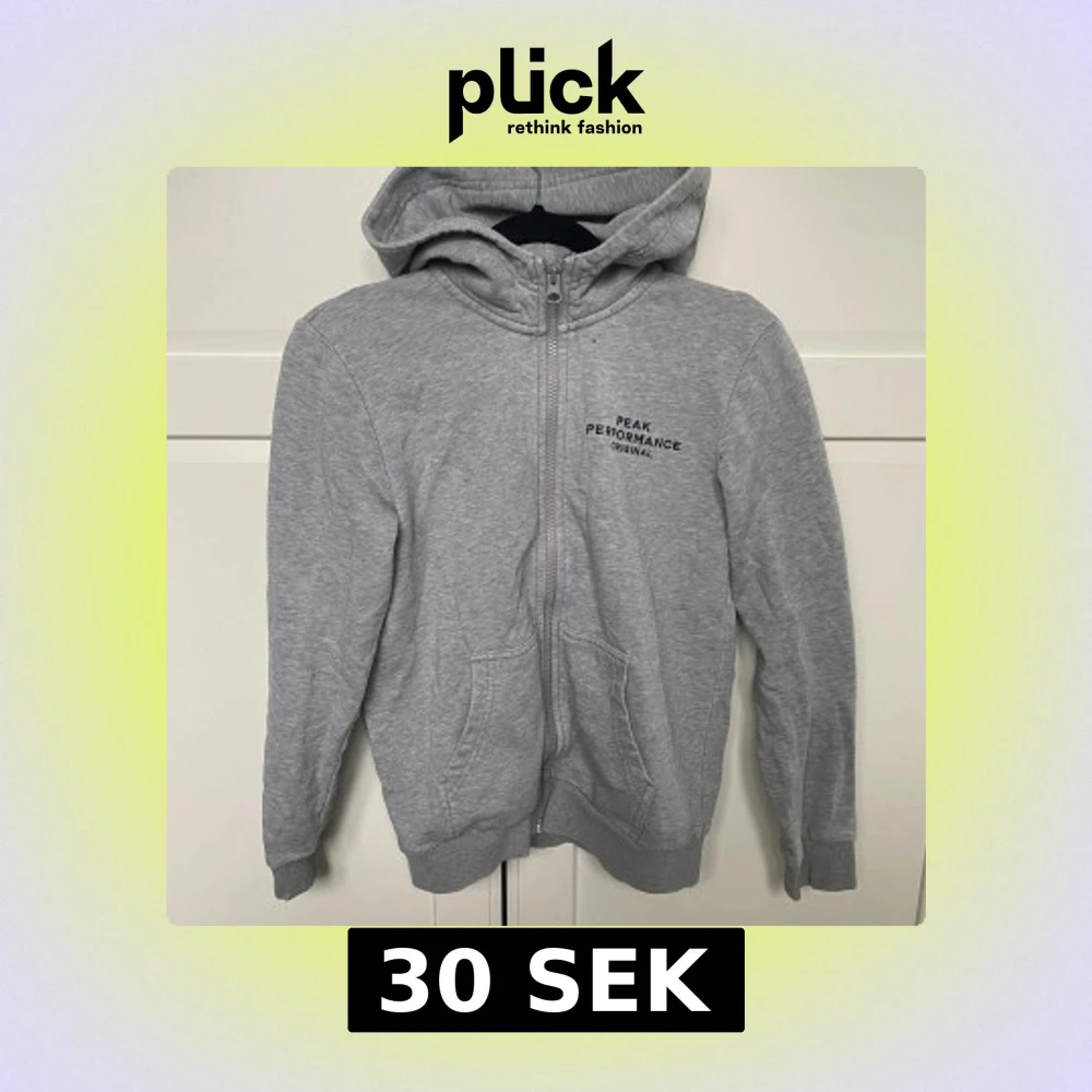 Säljer en grå hoodie från Peak Performance med dragkedja och huva. Tröjan har två fickor framtill och logga på bröstet. 2 små svarta färgfläckar som inte går bort