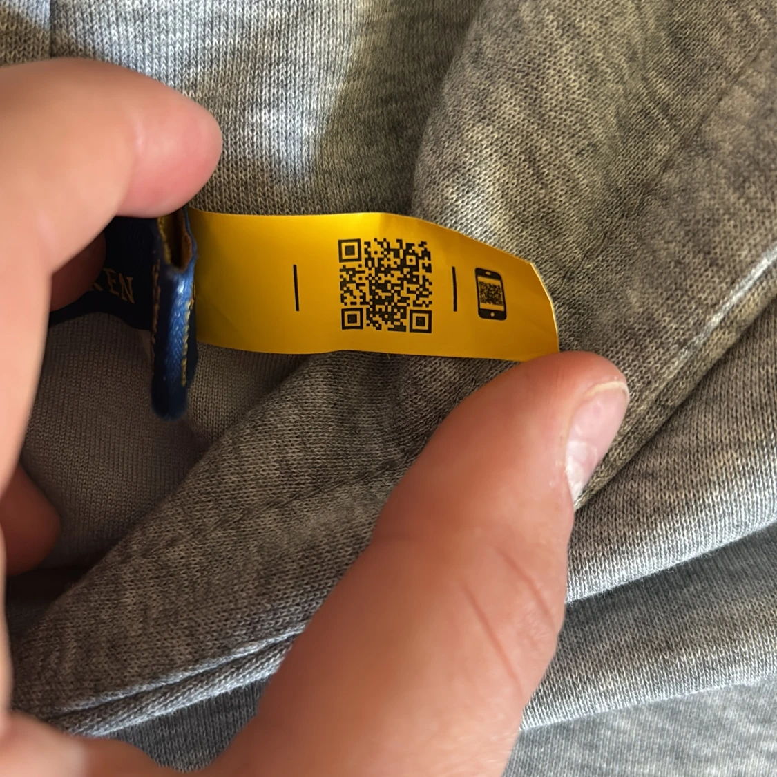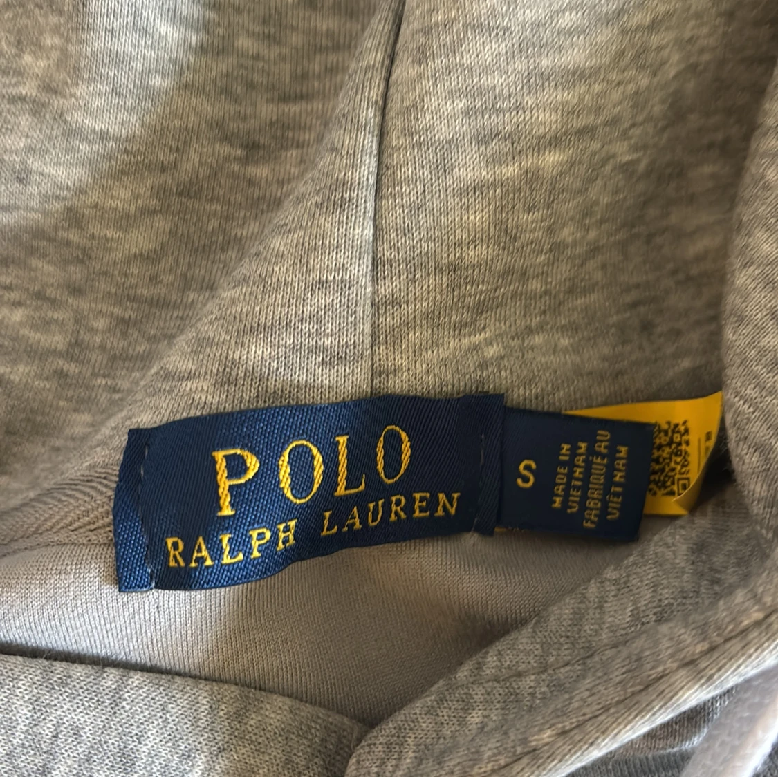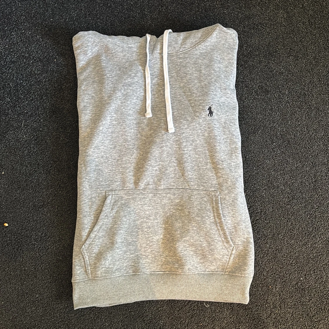 Säljer en stilren grå hoodie från Polo Ralph Lauren i storlek S. Tröjan har huva med vita snören, klassisk känguruficka och den ikoniska lilla Polo-loggan broderad på bröstet. Perfekt för chill dagar och enkel att matcha med jeans eller joggers.