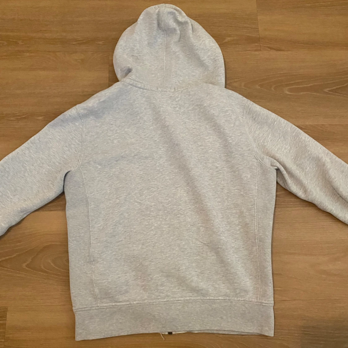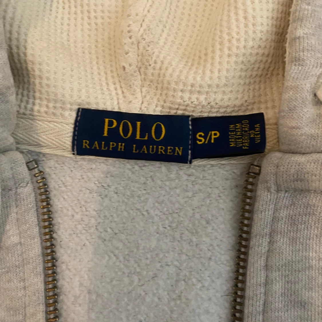Snygg ljusgrå hoodie från Polo Ralph Lauren med dragkedja och huva med vita snören. Tröjan har det klassiska Polo-logot broderat på bröstet och två fickor framtill.
