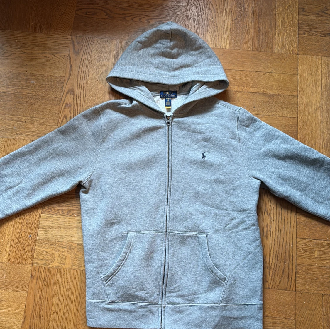 Säljer en stilren grå hoodie från Polo Ralph Lauren med dragkedja och huva. Tröjan har långa ärmar och en liten broderad logga på bröstet. Perfekt för en avslappnad look.