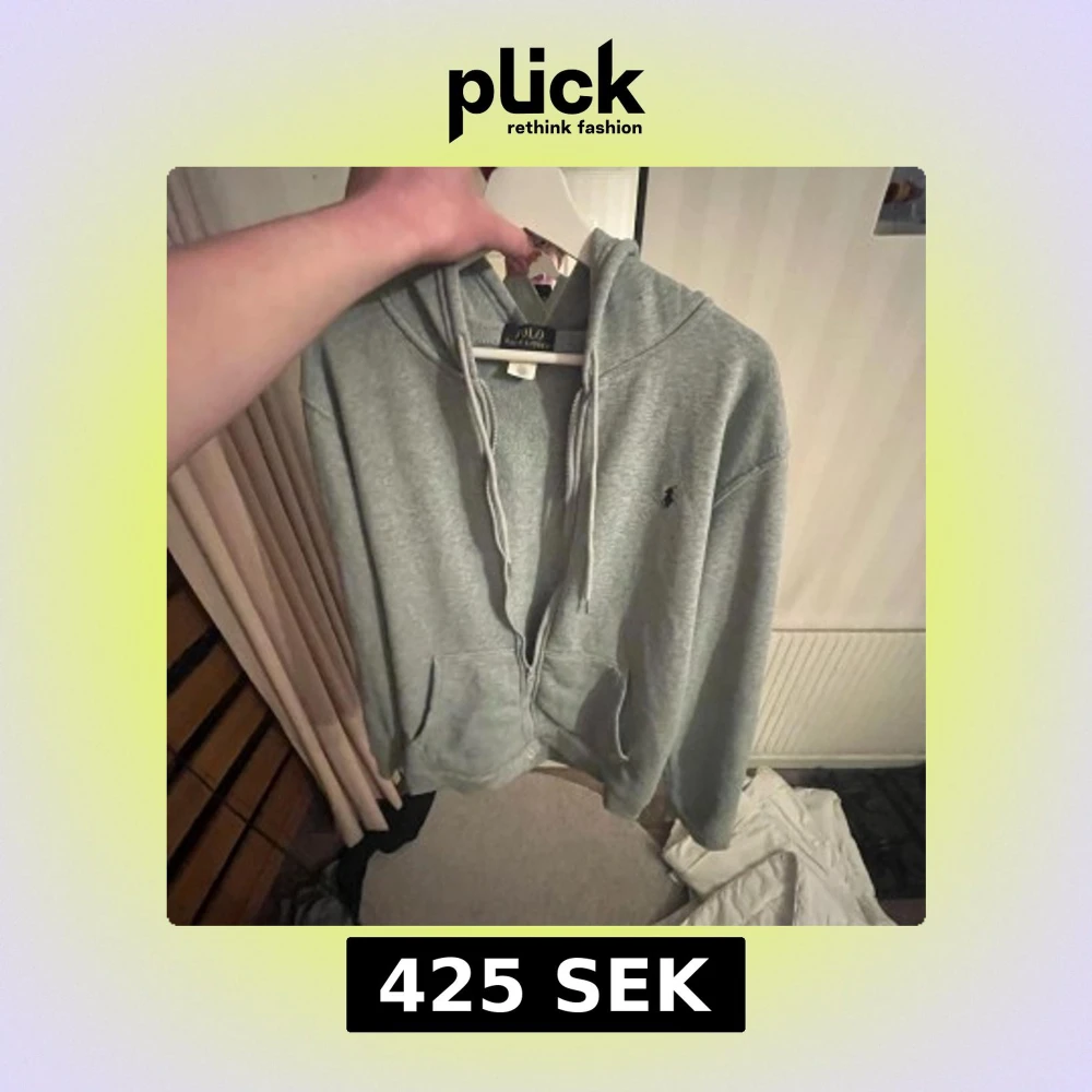 Säljer en klassisk grå hoodie från Polo med dragkedja och huva. Tröjan har två fickor framtill och en liten broderad logga på bröstet. Perfekt för en avslappnad stil.
