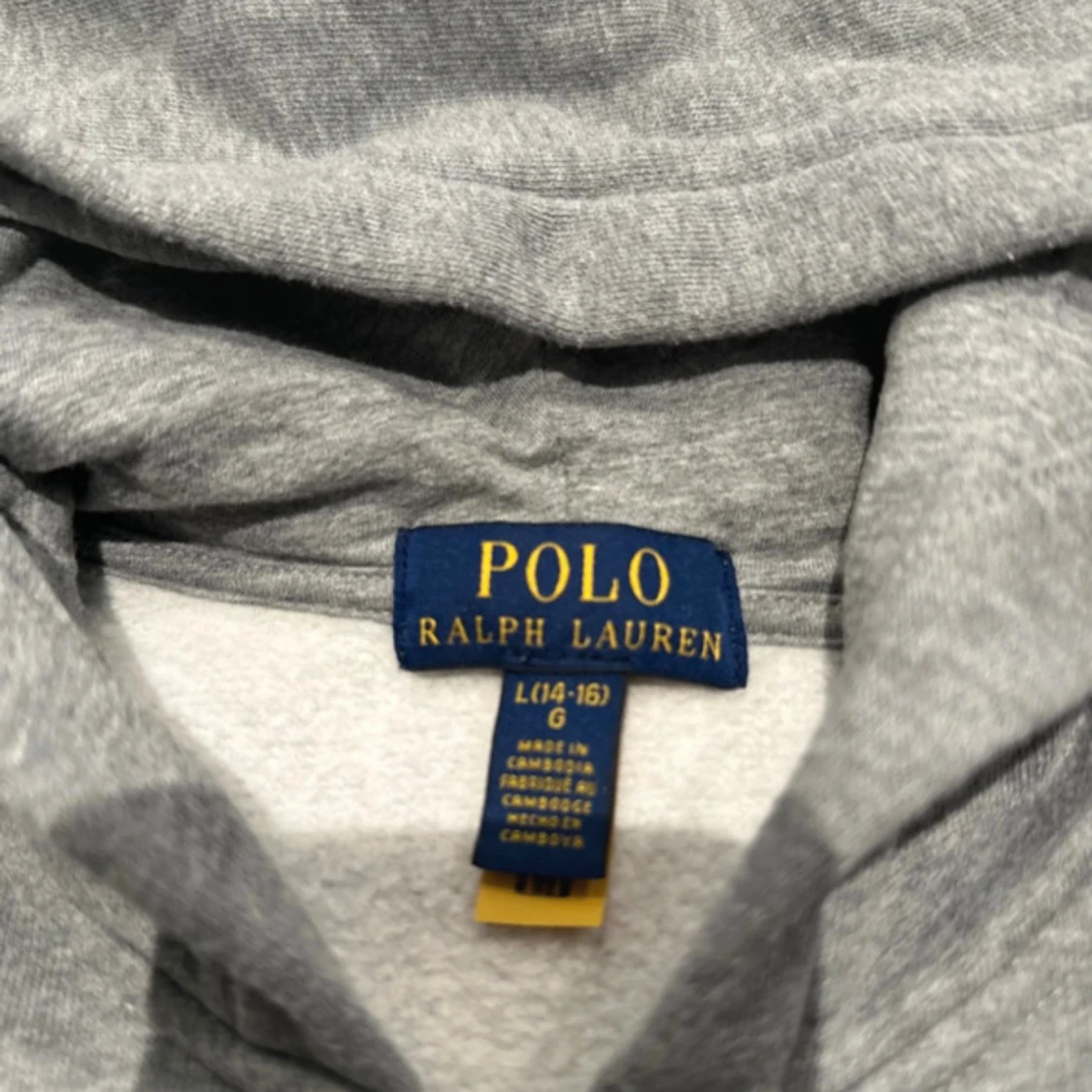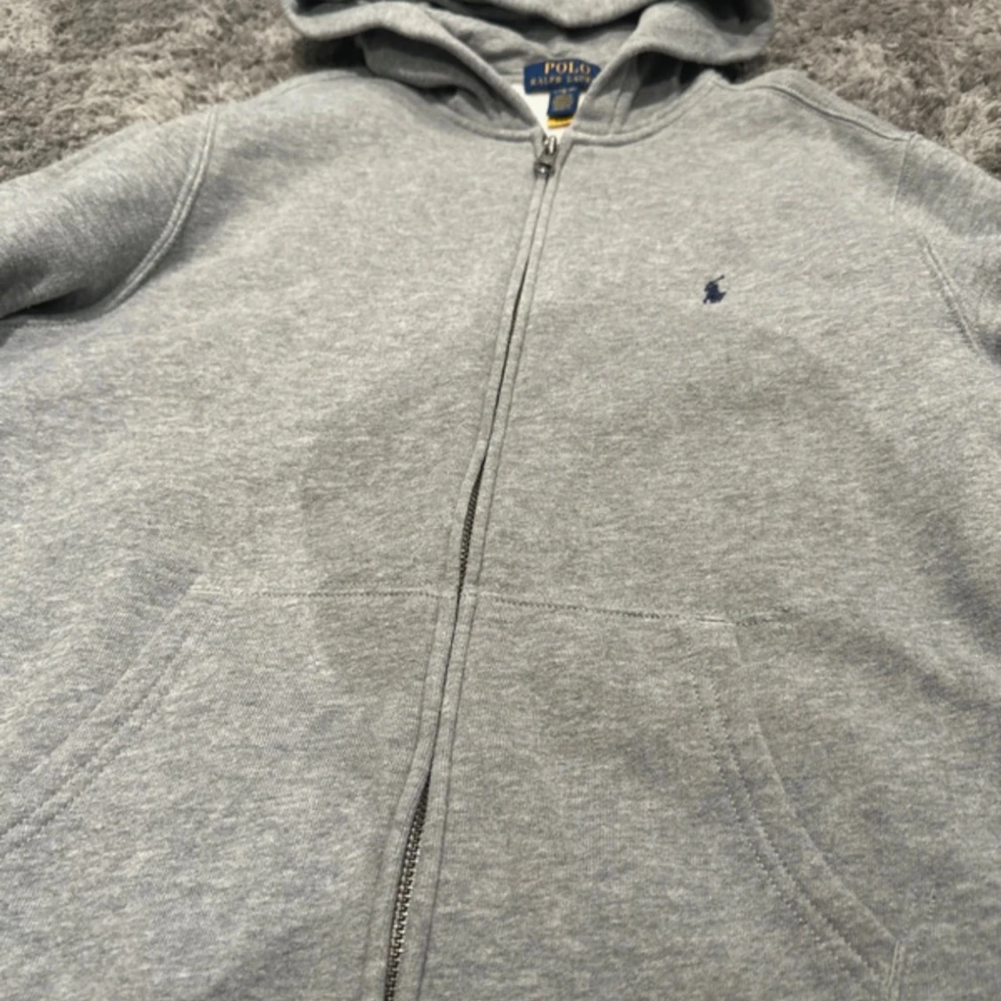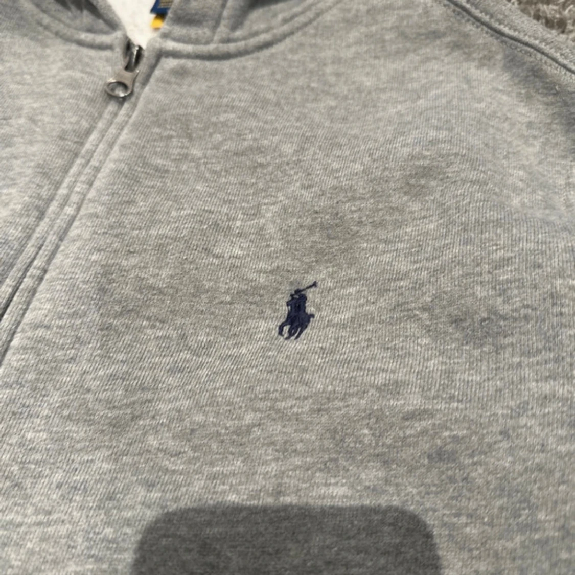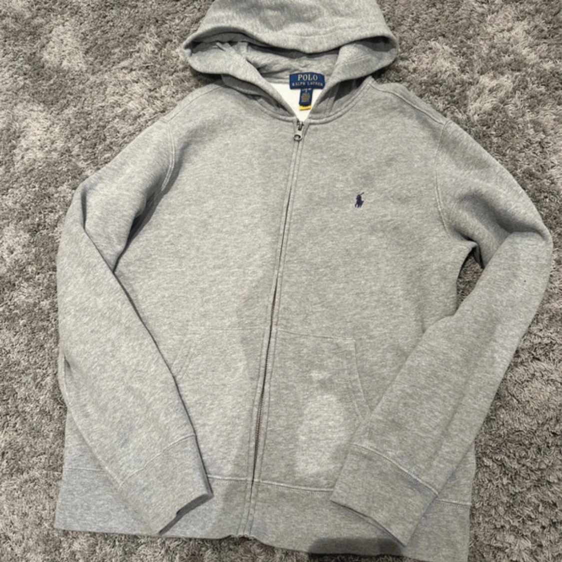 Snygg grå hoodie från Polo Ralph Lauren med dragkedja framtill och klassisk broderad logga på bröstet. Tröjan har huva, känguruficka Perfekt för chill dagar eller när du vill ha en clean look. Säljer även därför ingen användning Nypris 1200kr stl (164)