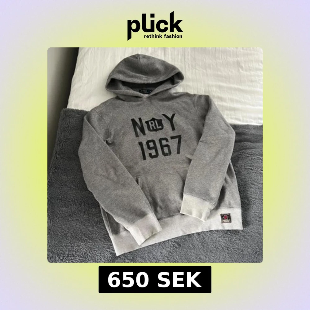 Säljer en grå hoodie från Polo Ralph Lauren med tryck 'N RLY 1967' på bröstet. Tröjan har huva, magficka och ribbade muddar vid ärmslut och nederkant. Perfekt för en avslappnad och sportig stil.
