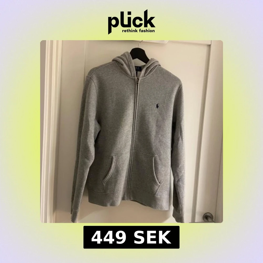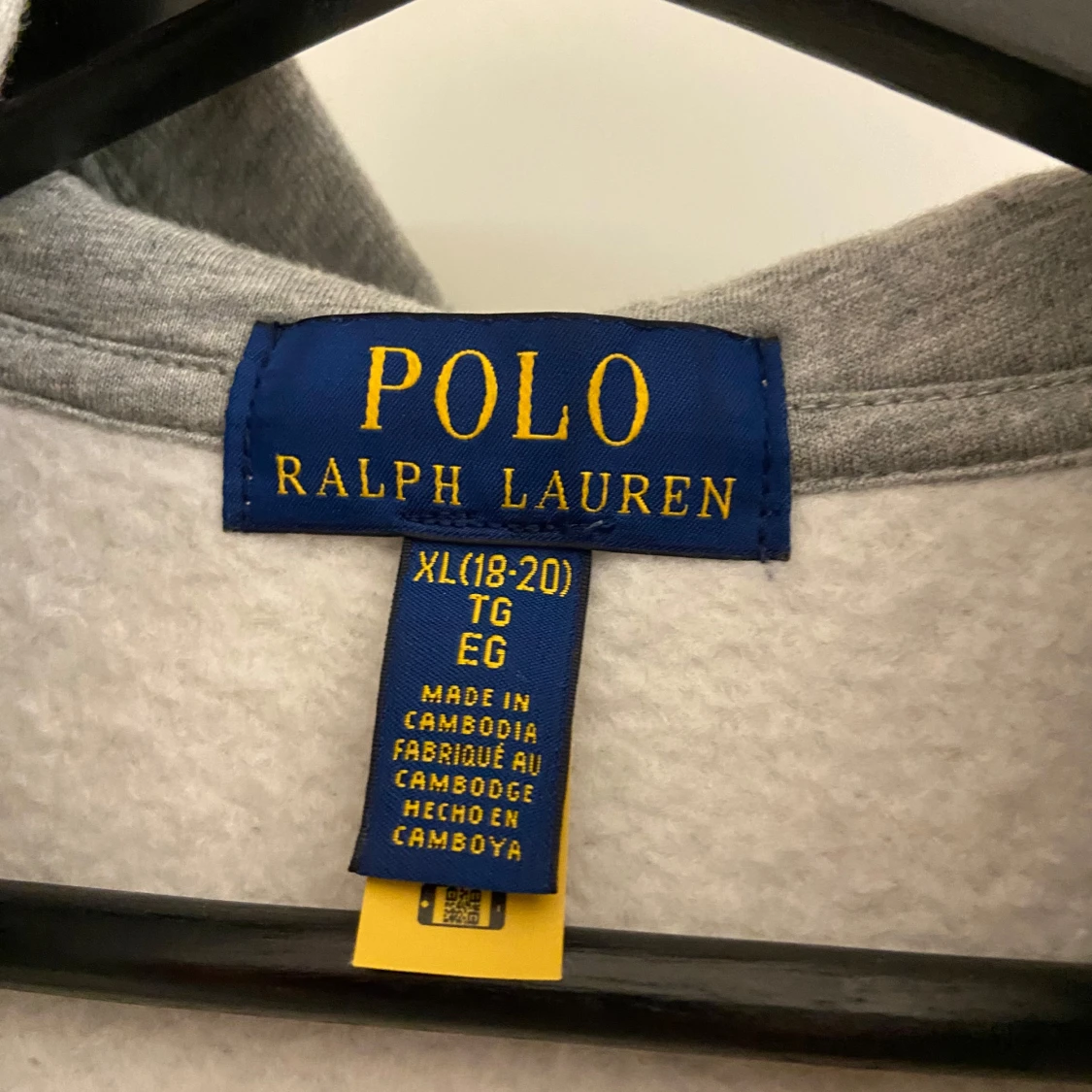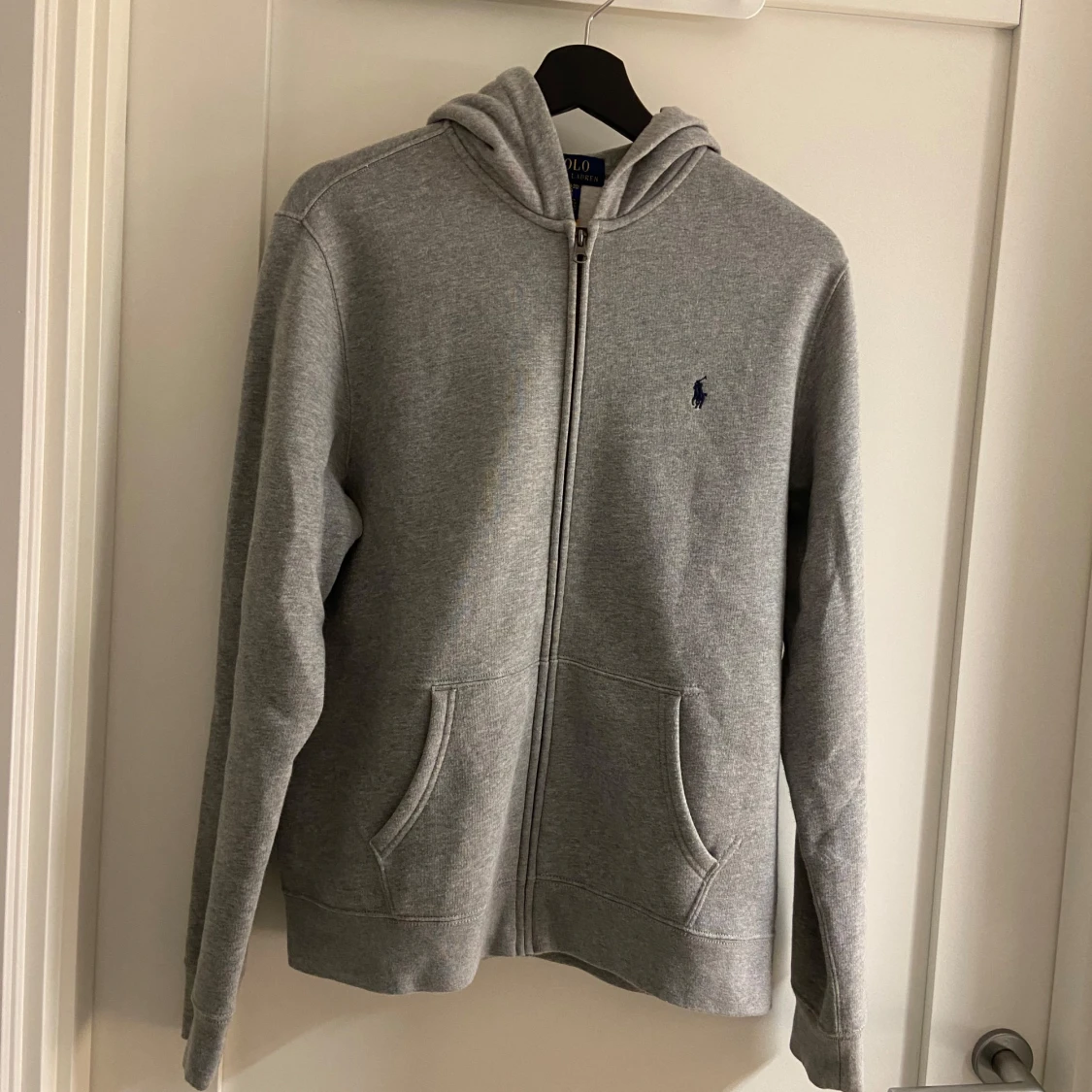 Klassisk grå hoodie från Polo Ralph Lauren. Tröjan har dragkedja, huva och två fickor framtill. Liten mörkblå logga broderad på bröstet. Storlek 18-20 motsvarar ungefär S i vanlig storlek