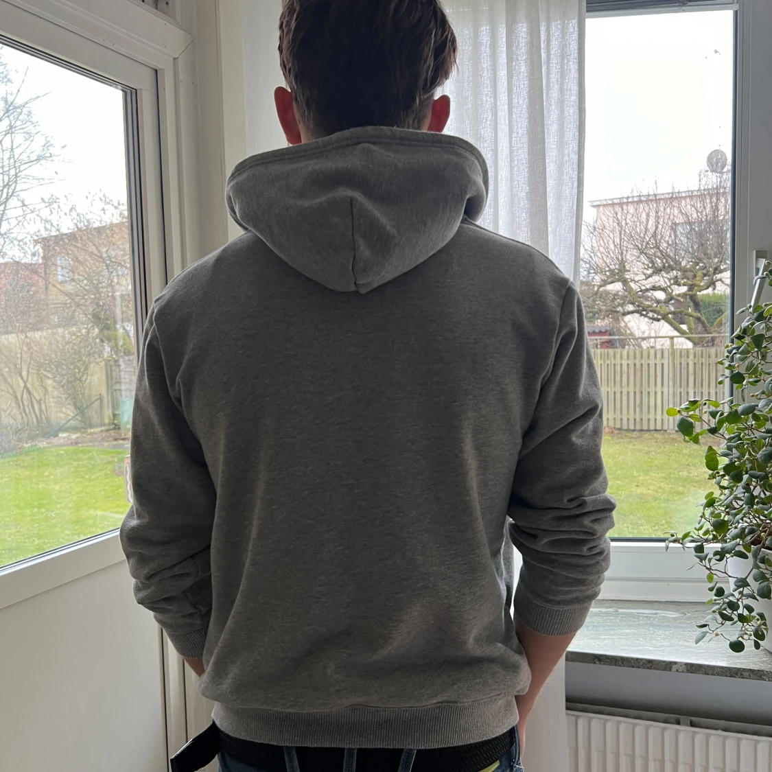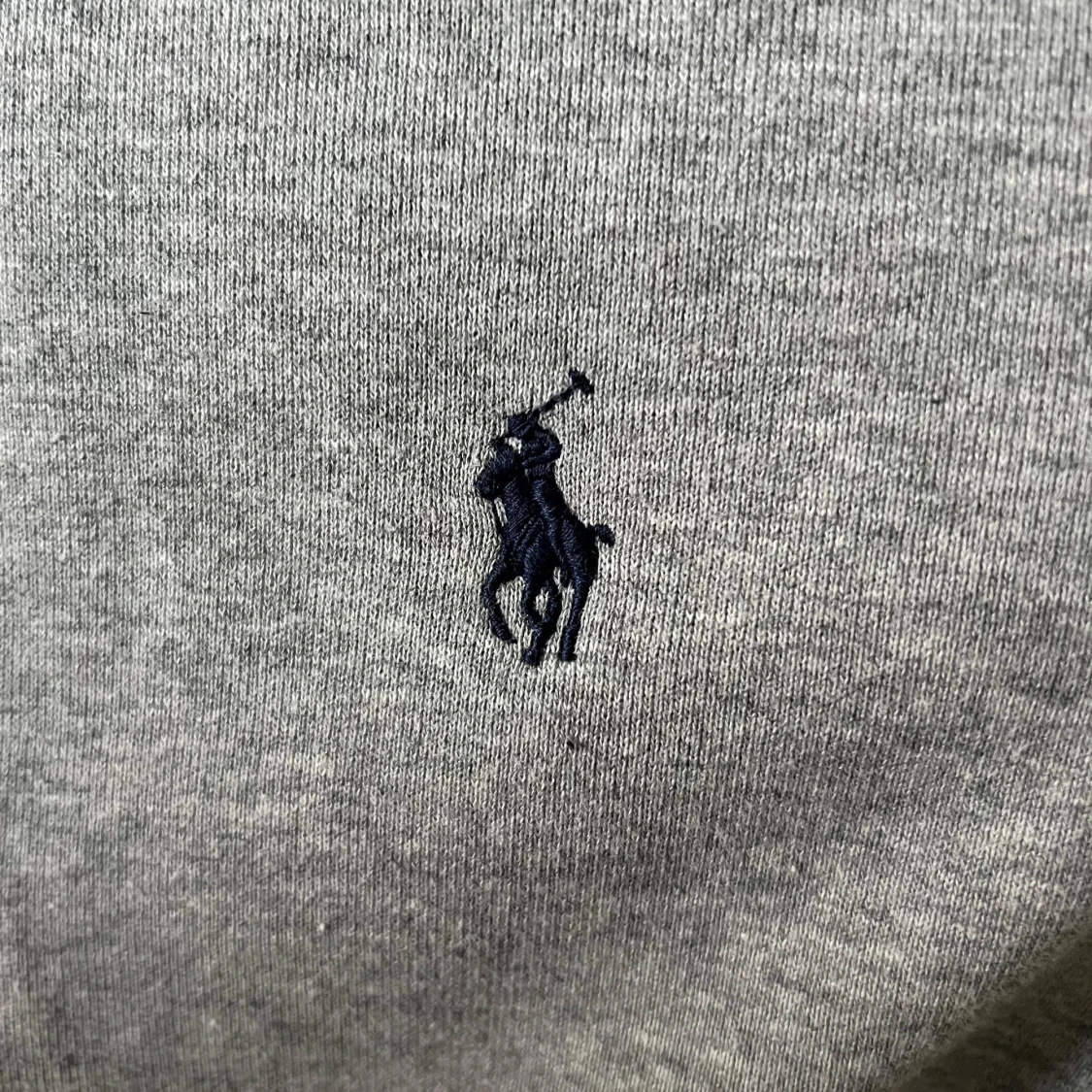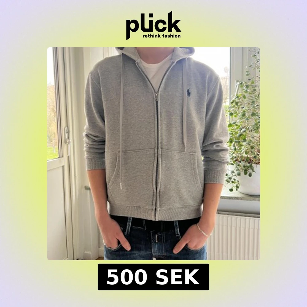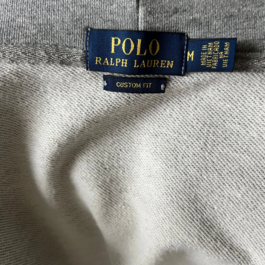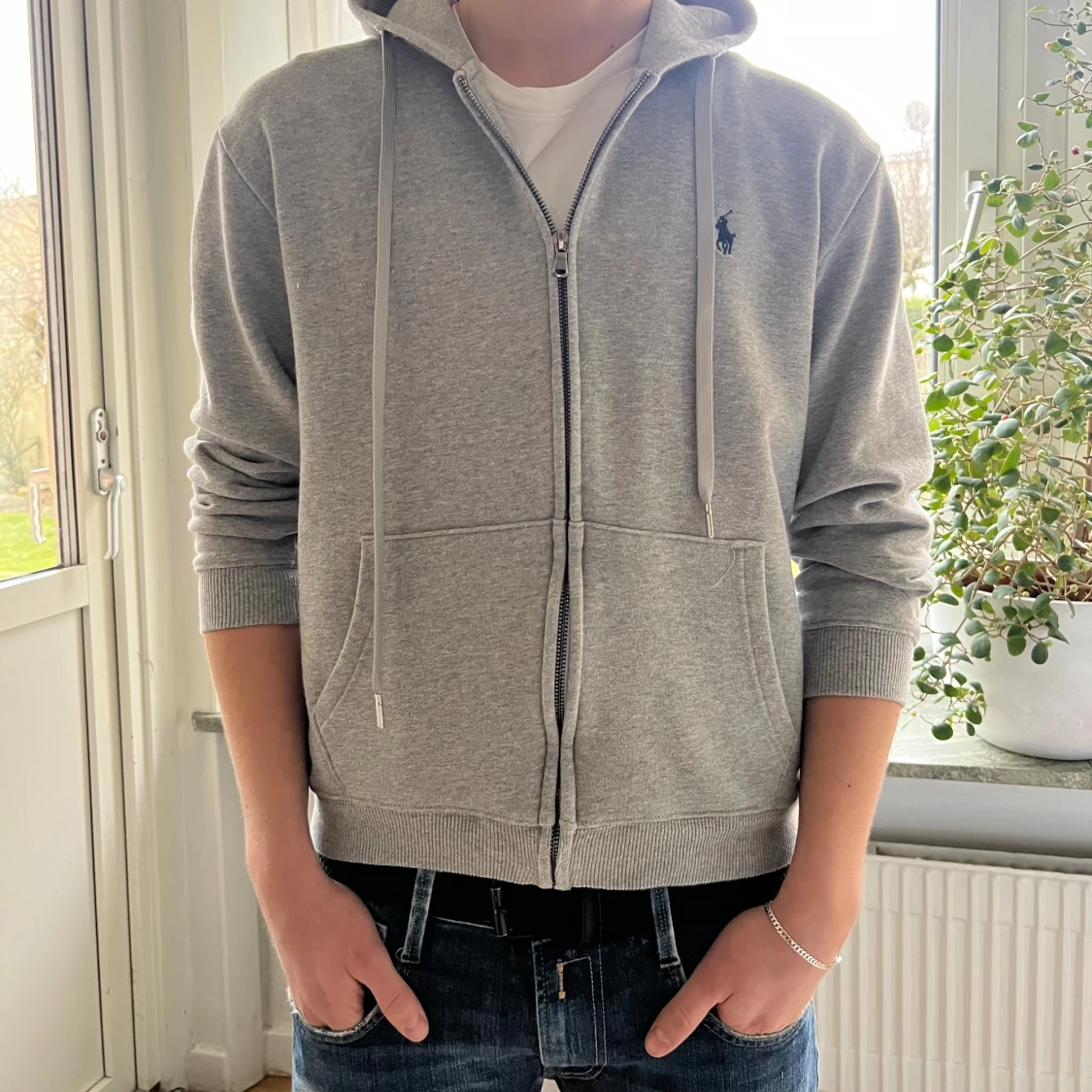 Säljer en klassisk grå hoodie från Polo Ralph Lauren med dragkedja och huva. Tröjan har ribbade muddar, två fickor fram och den ikoniska broderade loggan på bröstet. Perfekt för en avslappnad stil.