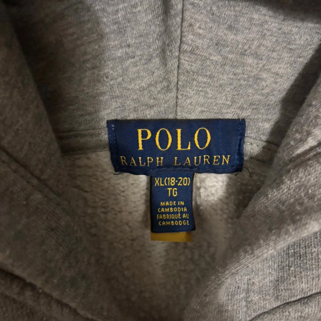 Klassisk grå hoodie från Polo Ralph Lauren i storlek XL. Tröjan har dragkedja, huva och två fickor framtill. Broderad marinblå logga på bröstet. Mjuk och skön bomullsblandning, perfekt för chill dagar.