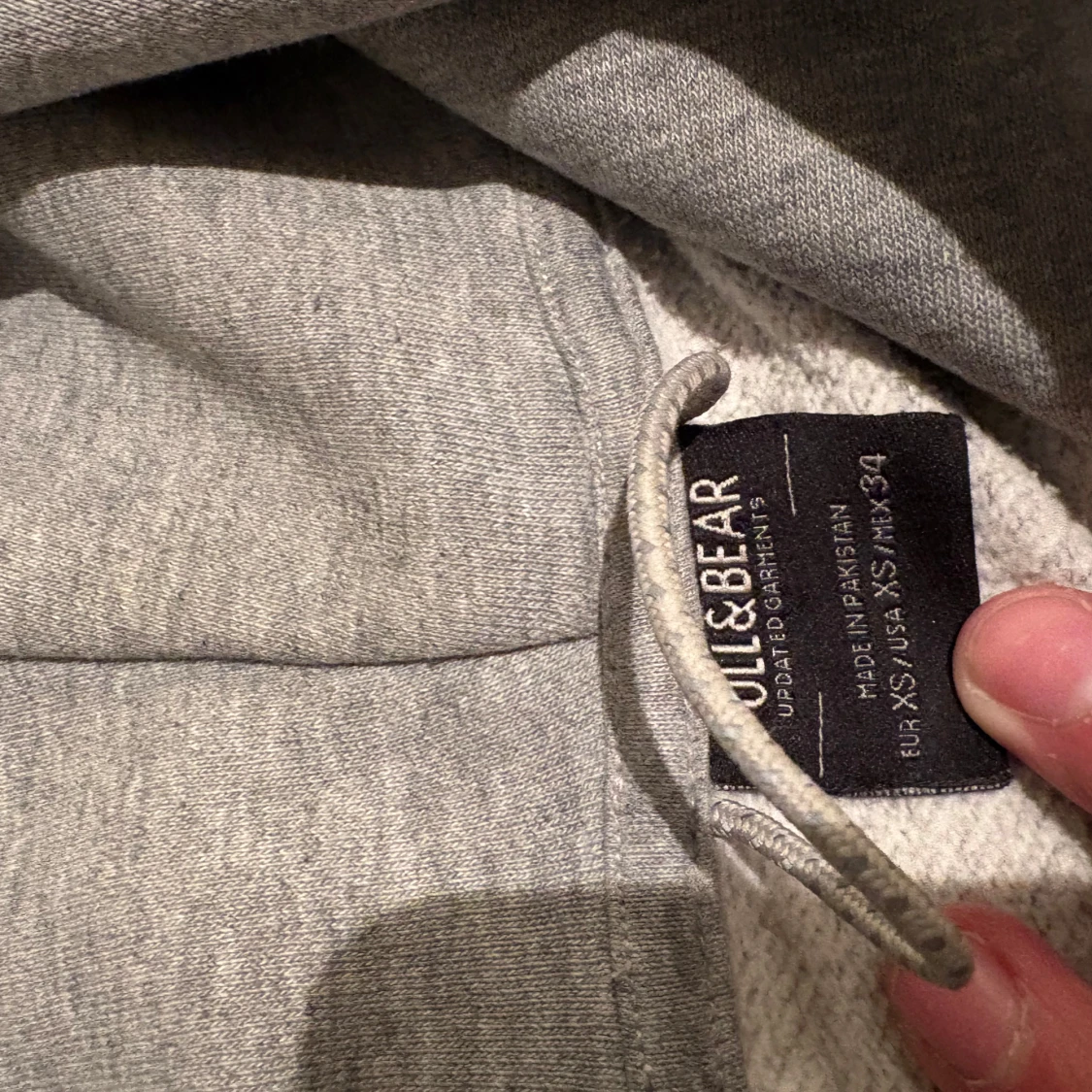Säljer en enkel och snygg grå hoodie från Pull&Bear i storlek XS. Tröjan har huva med snörning, praktiska fickor framtill och hel dragkedja. Perfekt för chill dagar eller när du vill ha något bekvämt och stilrent. Materialet är mjuk bomullsmix.