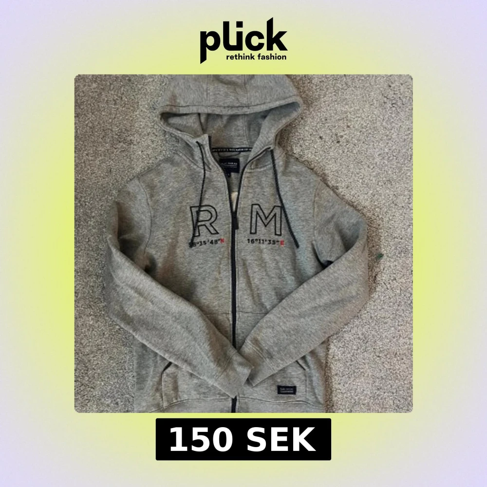 Säljer en grå hoodie från Race Marine i storlek S. Tröjan har huva med snörning, hel dragkedja och fickor framtill. På bröstet finns tryck med RM och koordinater. Mjuk insida och långärmad modell, perfekt för chill dagar.