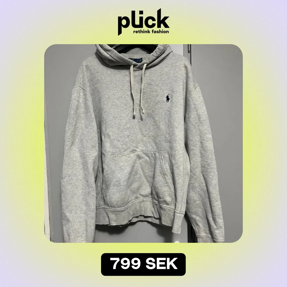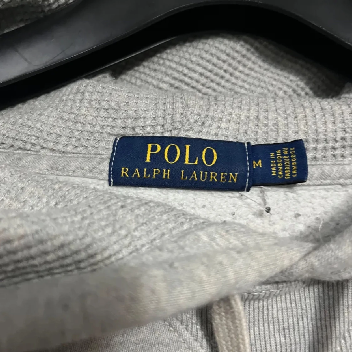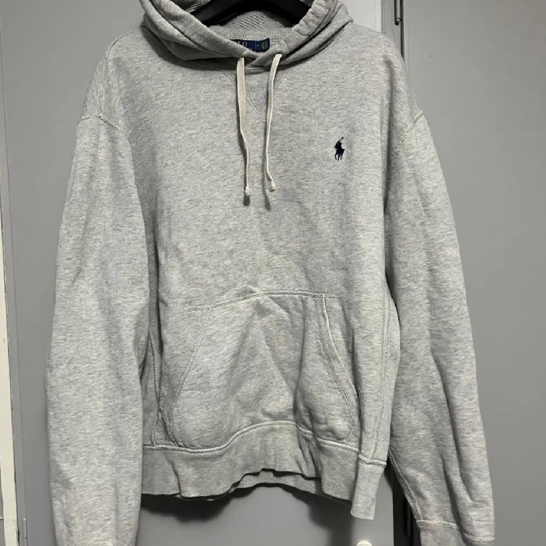 Säljer en klassisk grå hoodie från Ralph Lauren i storlek M. Den har en broderad logga på bröstet och en bekväm passform med känguruficka framtill. Perfekt för både höst och vår. Hör av dig vid intresse! 😊