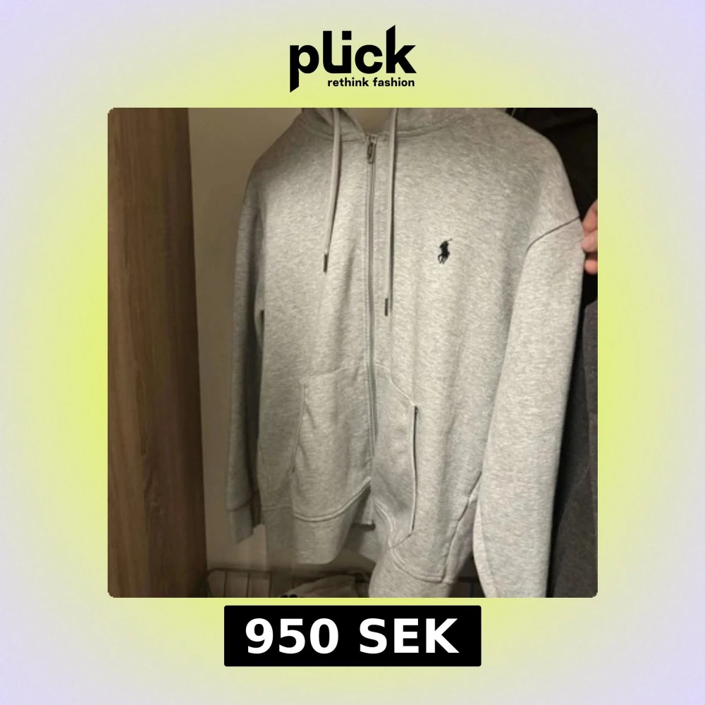 Säljer en stilren grå hoodie från Ralph Lauren med dragkedja och klassisk logga på bröstet. Tröjan har långa ärmar och en praktisk huva med dragsko. Perfekt för en avslappnad look.