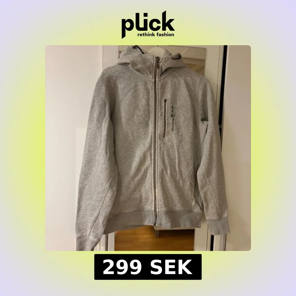 Grå hoodie från Sail Racing med dragkedja framtill och en bröstficka med dragkedja. Tröjan har huva med snörning och logga på bröstet. Perfekt för dig som gillar en clean och sportig stil. Blixtlåsgrejen på bröstet är borta därav priset.