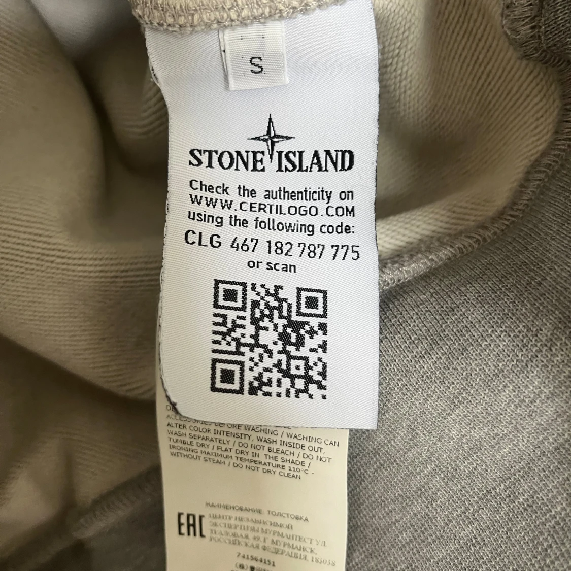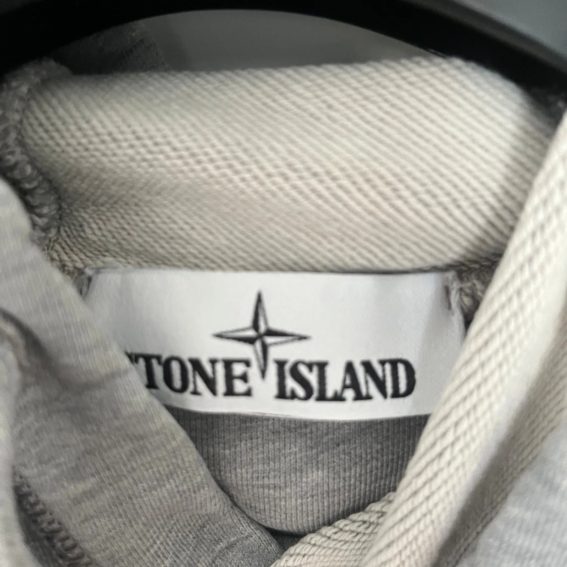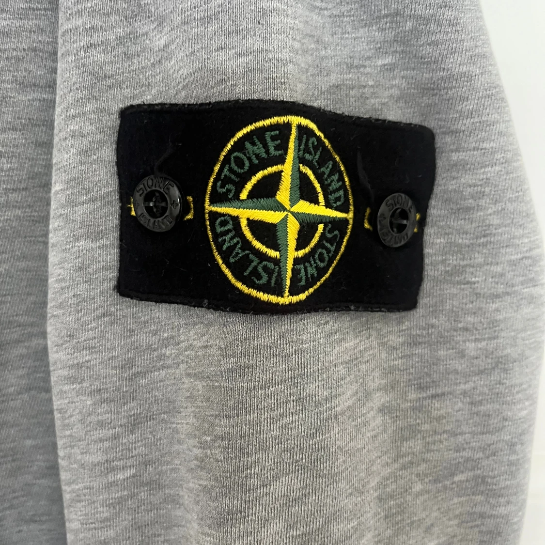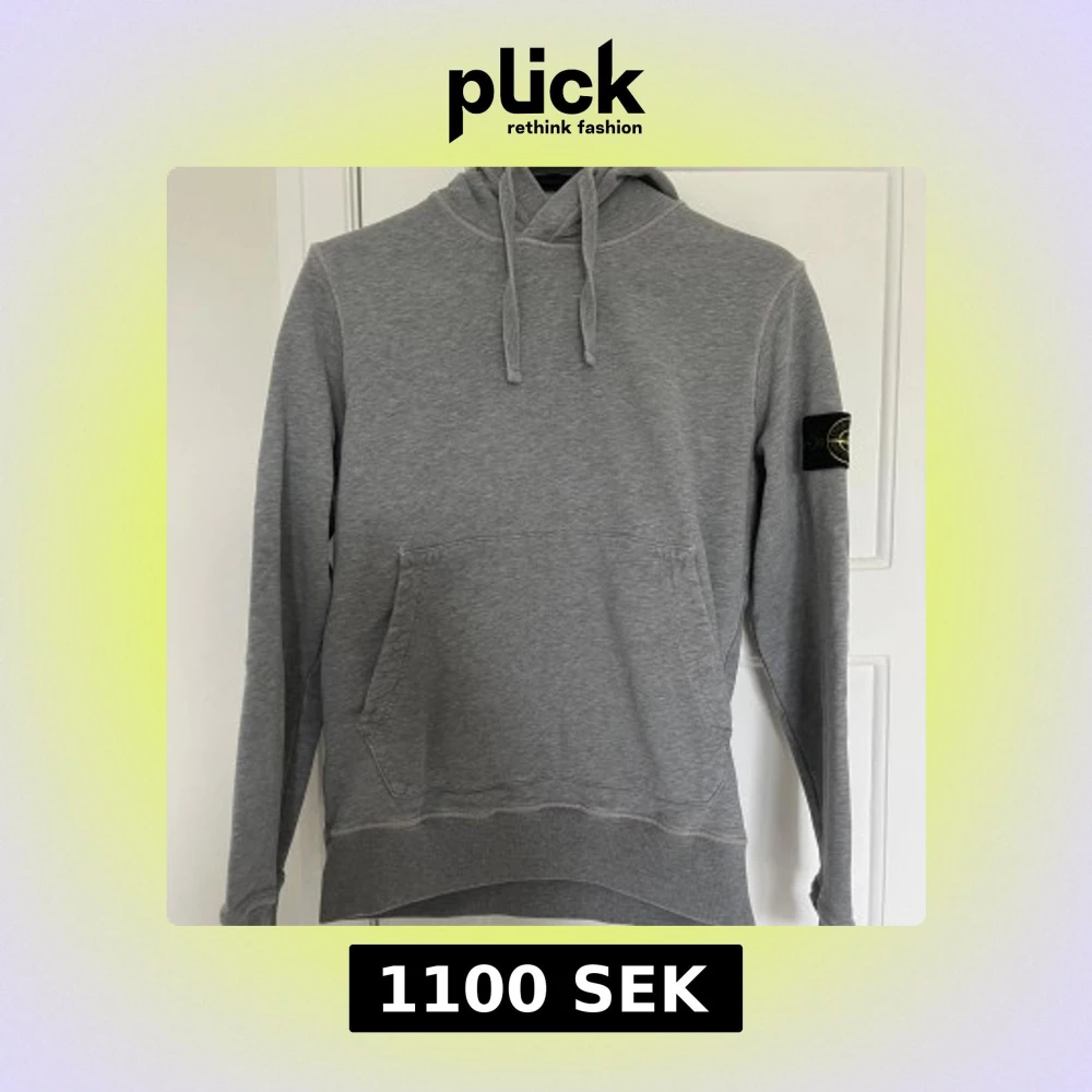 Säljer en stilren grå hoodie från Stone Island med klassisk patch på ärmen. Tröjan har huva med snörning, magficka och är tillverkad i mjuk bomull. Perfekt för dig som gillar streetwear och vill ha något bekvämt och snyggt.