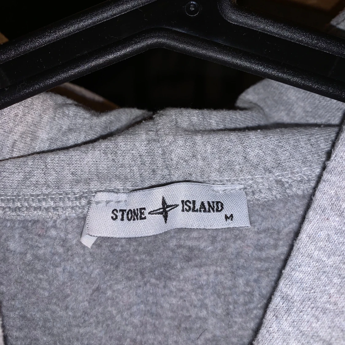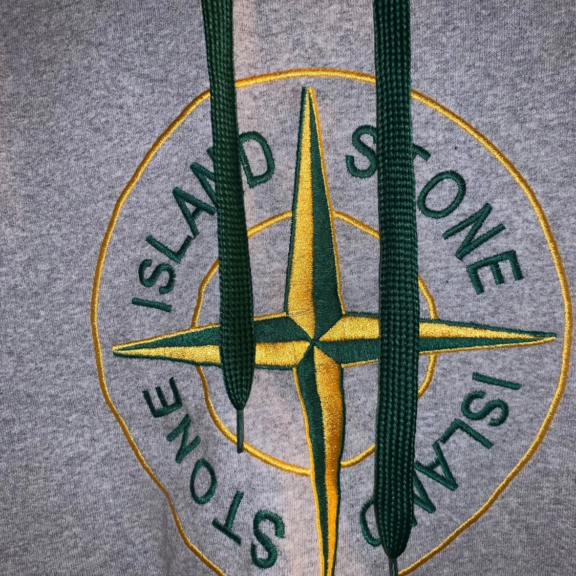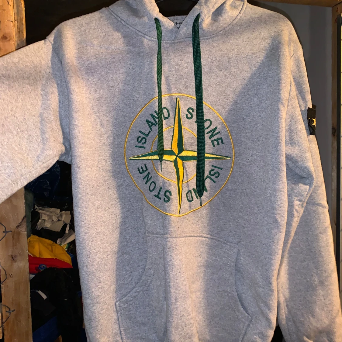 Säljer en grå hoodie från Stone Island med det ikoniska kompassmärket broderat på bröstet. Hoodien har gröna dragsnören och en praktisk magficka. Barnstorlek M/ motsvarande S i vuxen