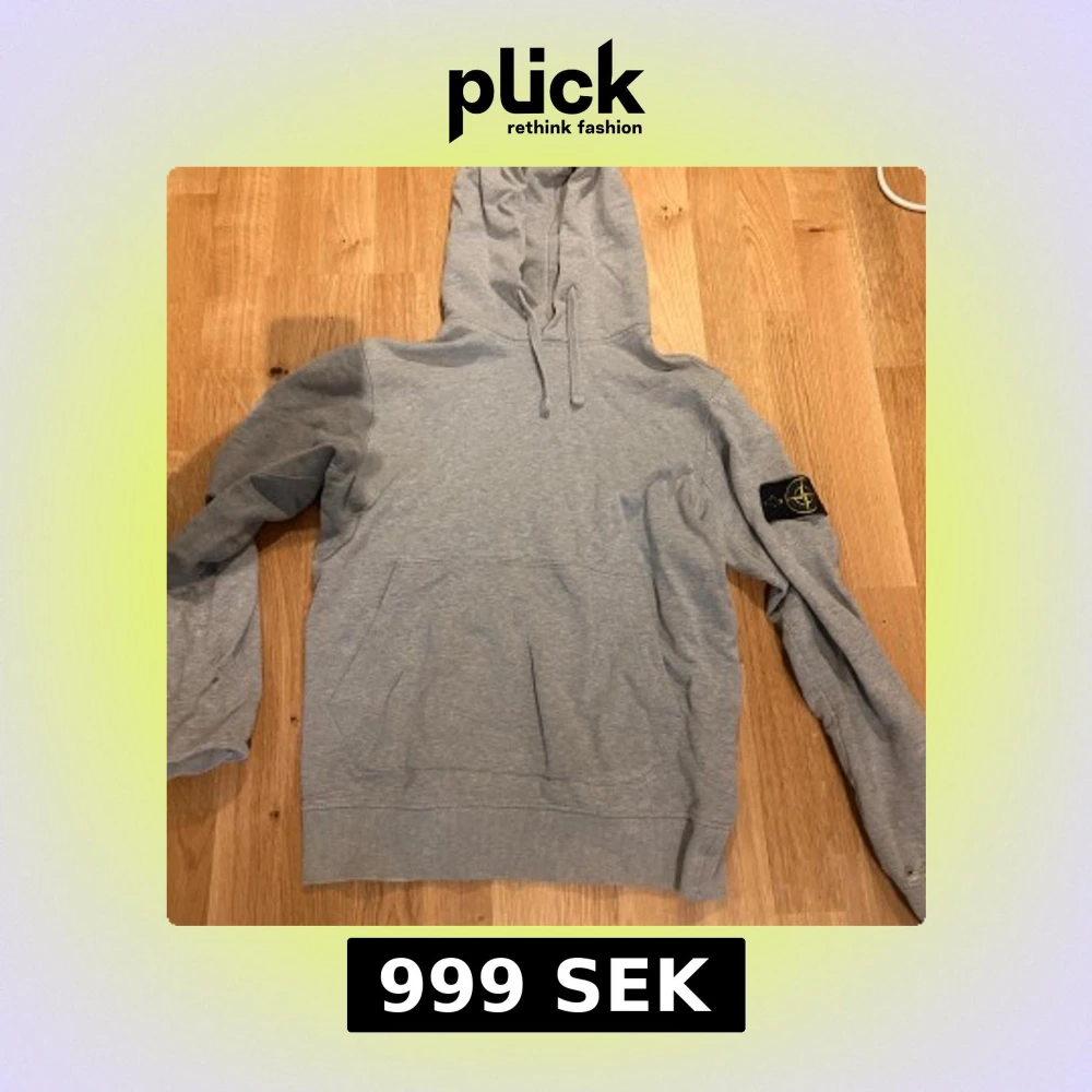 Säljer en stilren grå hoodie från Stone Island med klassisk logga på ärmen. Tröjan har en bekväm passform med känguruficka och justerbar huva. Perfekt för en avslappnad look. Den är äkta och går att autentiseras. Den har dock ett hål vid armbågen, annars är den i bra skick.
