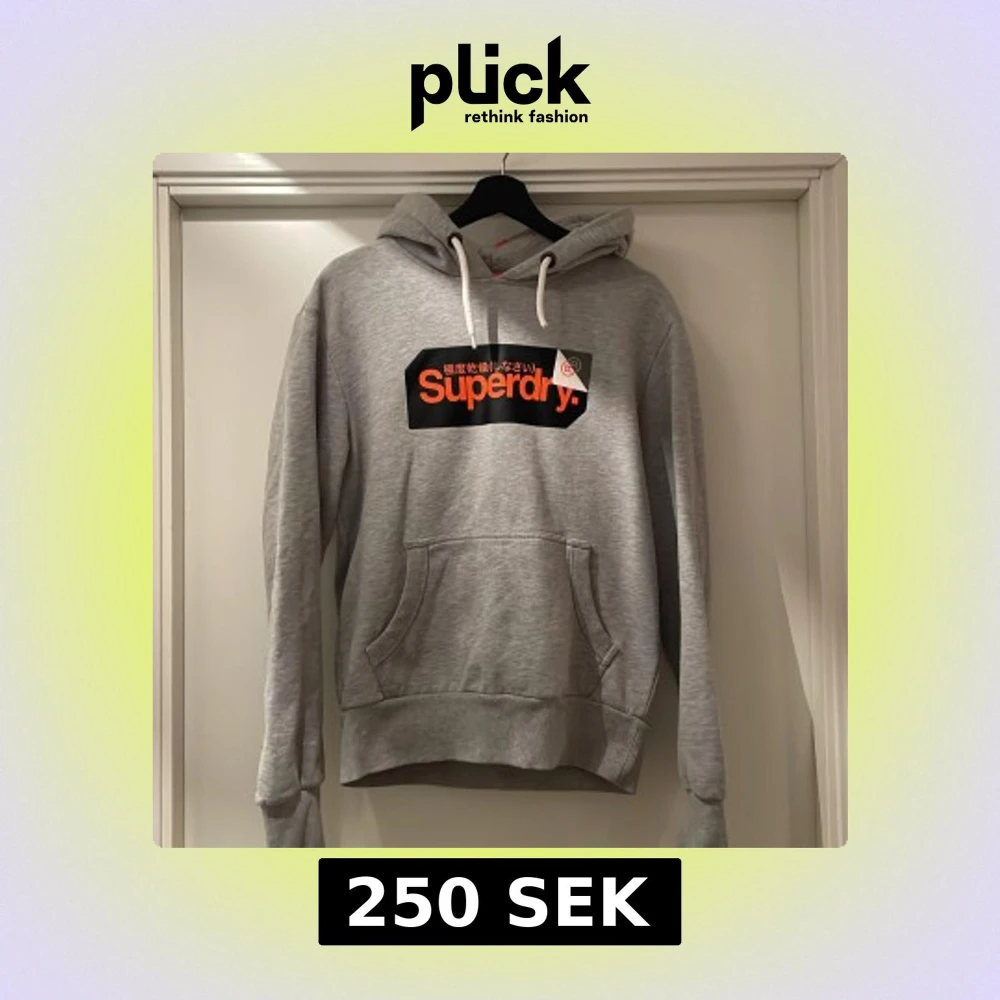 Säljer en grå hoodie från Superdry med en stor logga i orange och svart på bröstet. Tröjan har en klassisk känguruficka och justerbar huva med vita snören. Perfekt för en avslappnad stil.