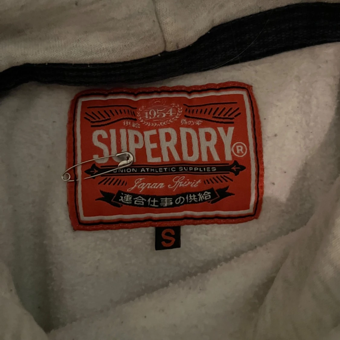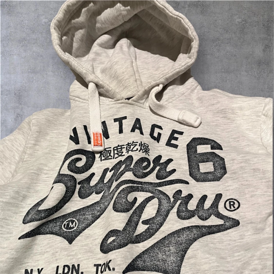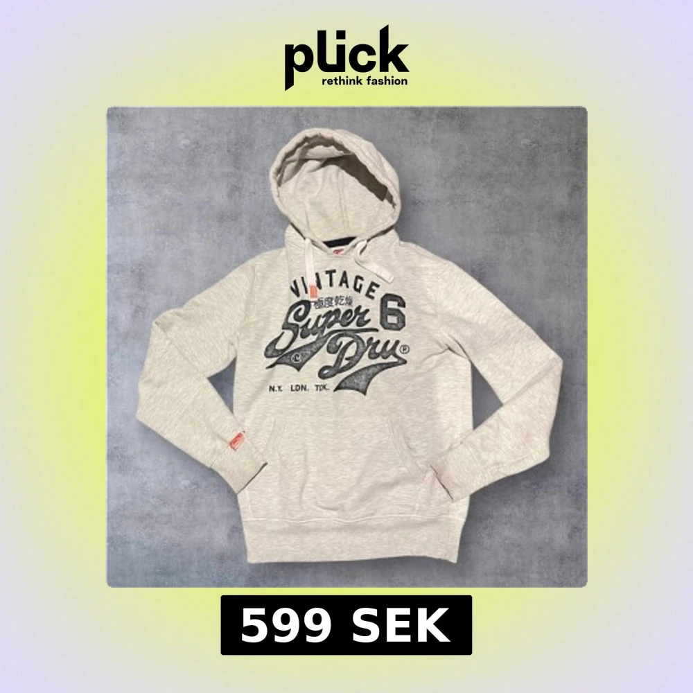Säljer en ljusgrå hoodie från Superdry med svart vintage-tryck på bröstet och coola japanska tecken. Tröjan har huva med snörning, känguruficka och långa ärmar. Perfekt för dig som gillar streetstyle och vill ha något bekvämt och snyggt.