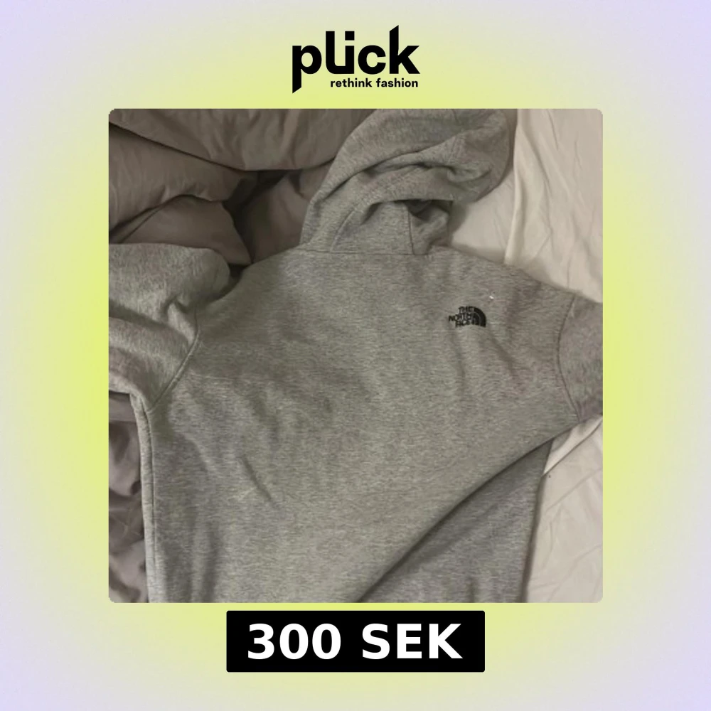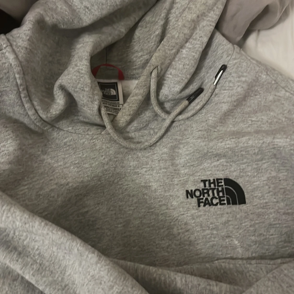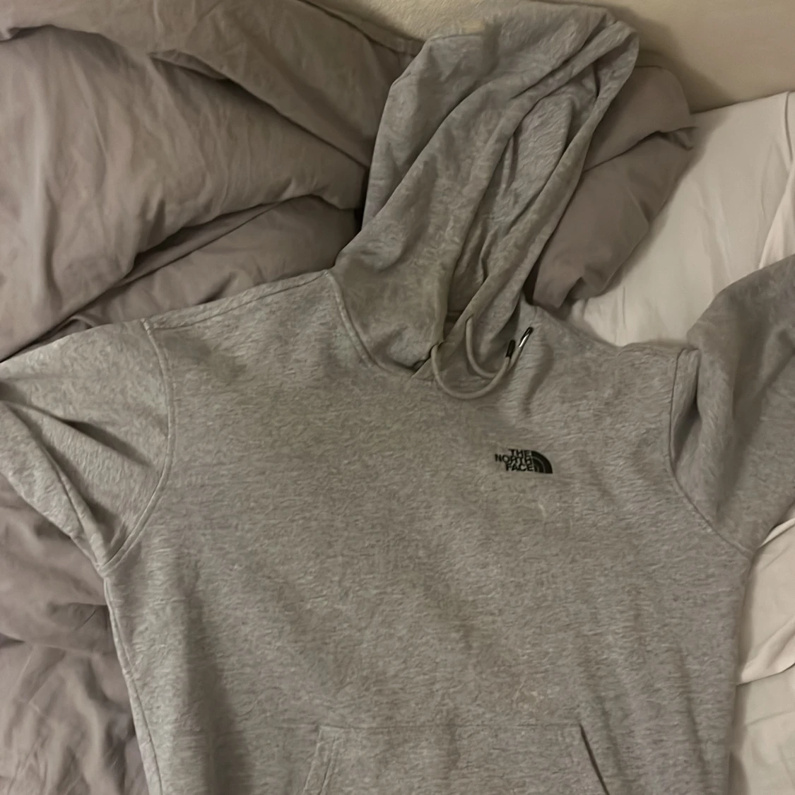 Säljer en grå hoodie från The North Face med svart broderad logga på bröstet. Tröjan har huva med snörning och en klassisk känguruficka framtill. Perfekt för chill dagar eller när du vill ha en enkel och stilren look.