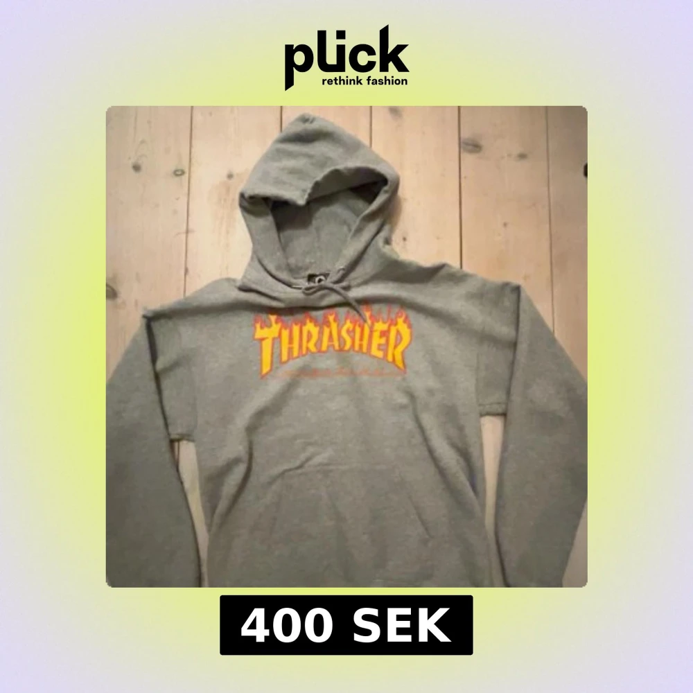 Säljer en grå hoodie från Thrasher. Tröjan har en klassisk passform med huva.