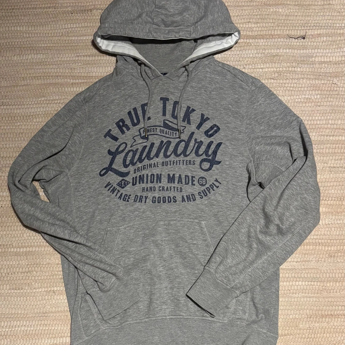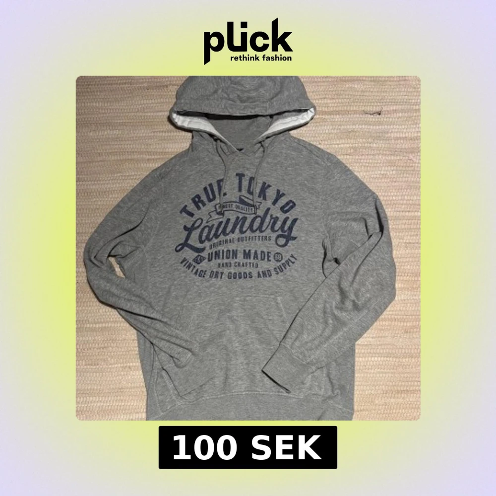 Säljer en grå hoodie från Tokyo Laundry med blå tryck framtill. Tröjan har huva med snörning och en stor magficka. Perfekt för dig som gillar en avslappnad och sportig stil. Mjuk bomullsblandning och långa ärmar. Kontakta vid frågor!