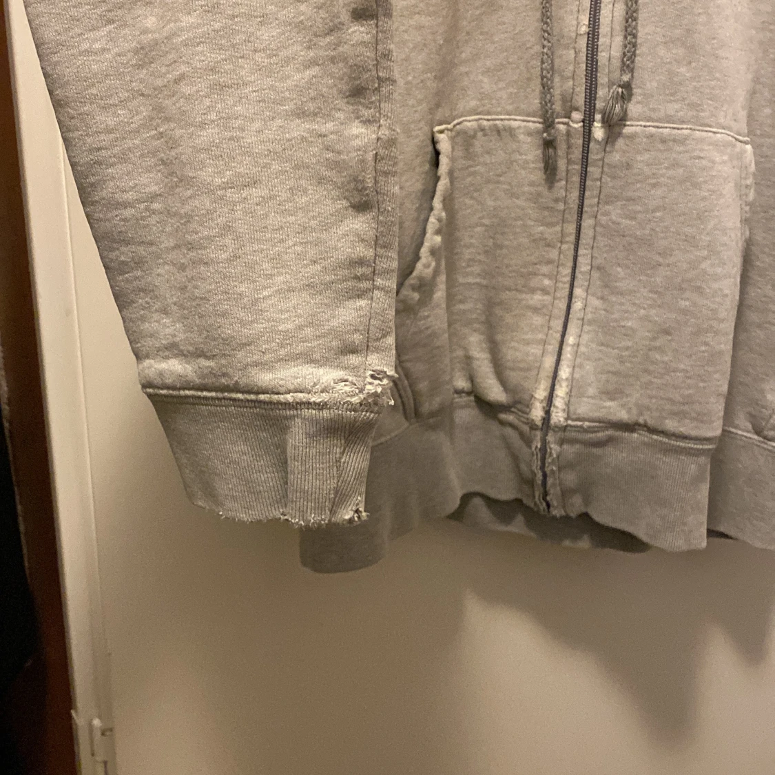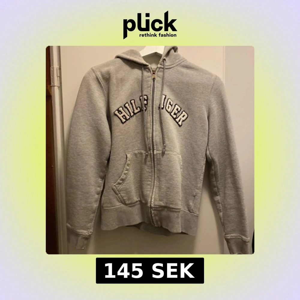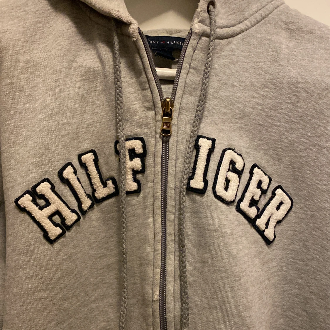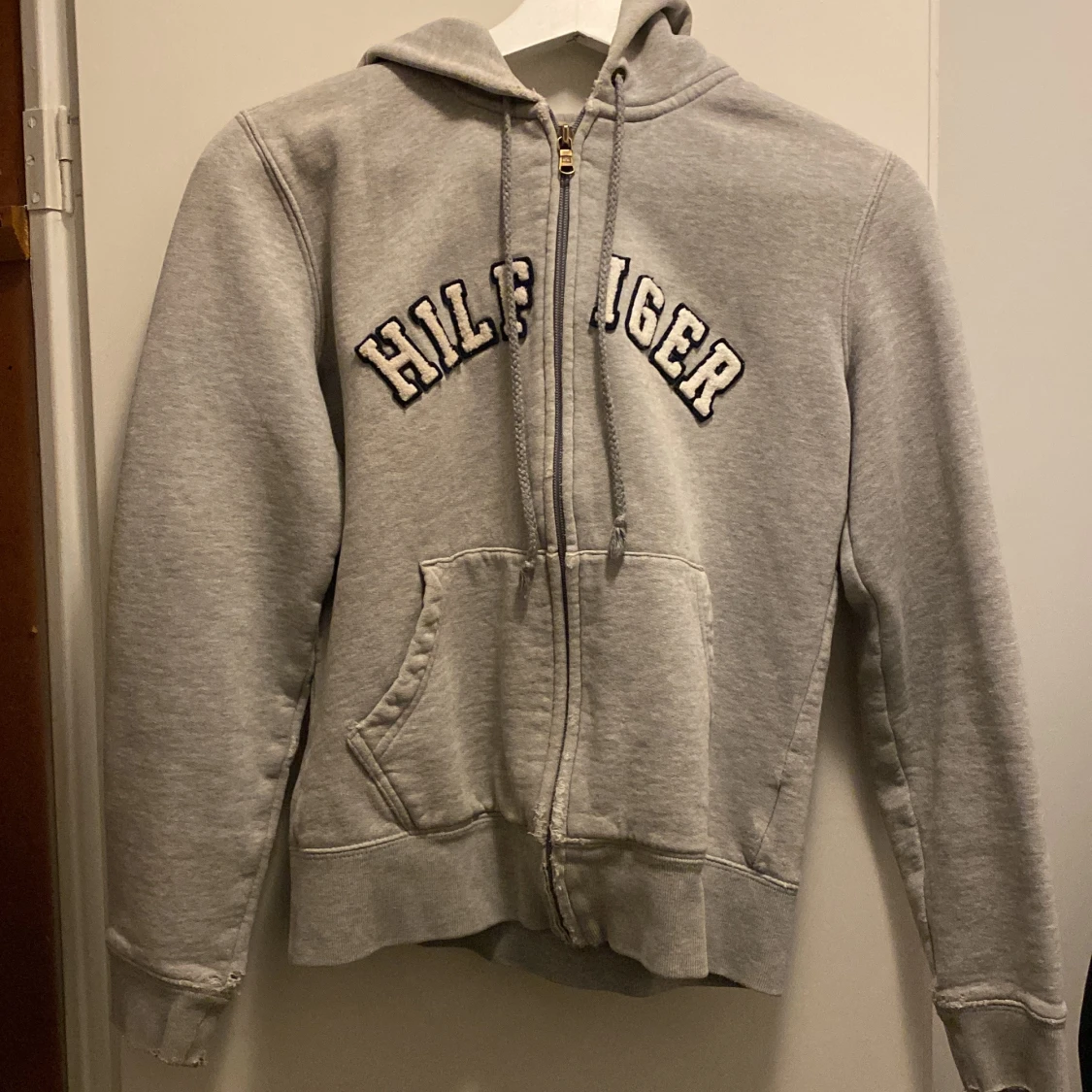 Säljer en klassisk grå hoodie från Tommy Hilfiger med dragkedja och stor ficka framtill. Hoodien har ett broderat Hilfiger-logotyp på bröstet och justerbar huva med snören. Den är INTE för oanvänd utan det slitna är själva designen 😍