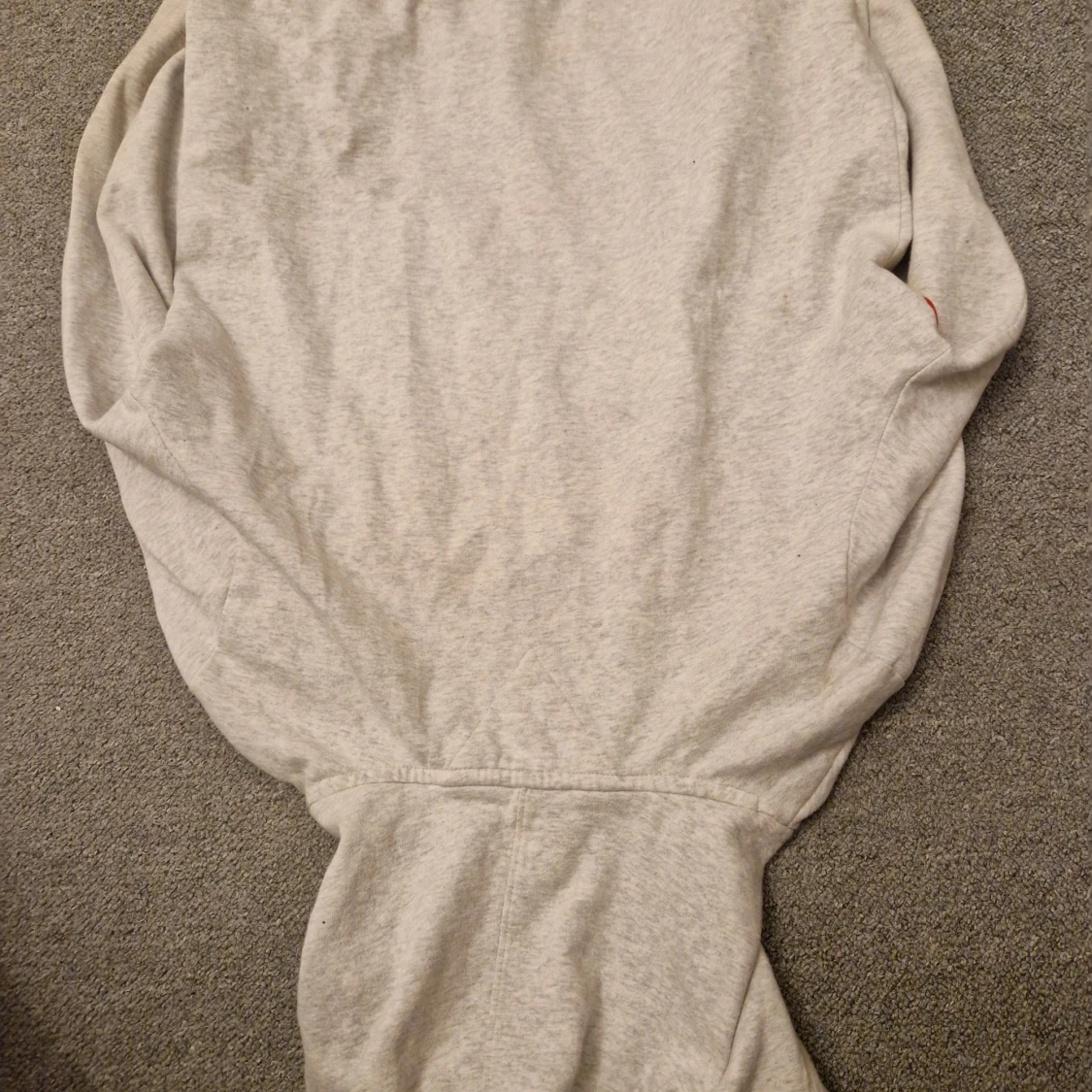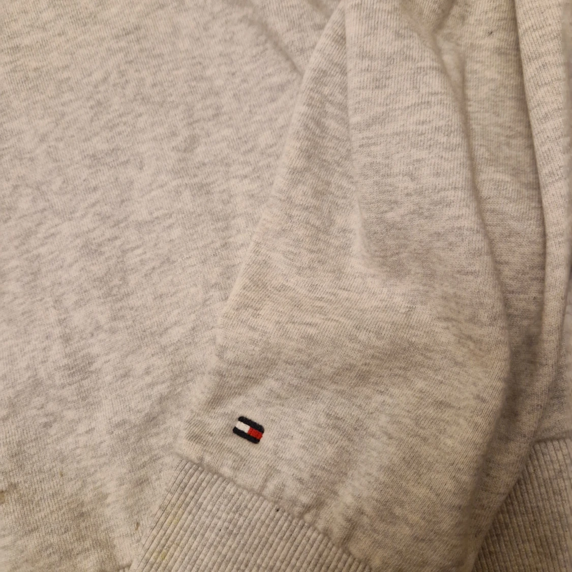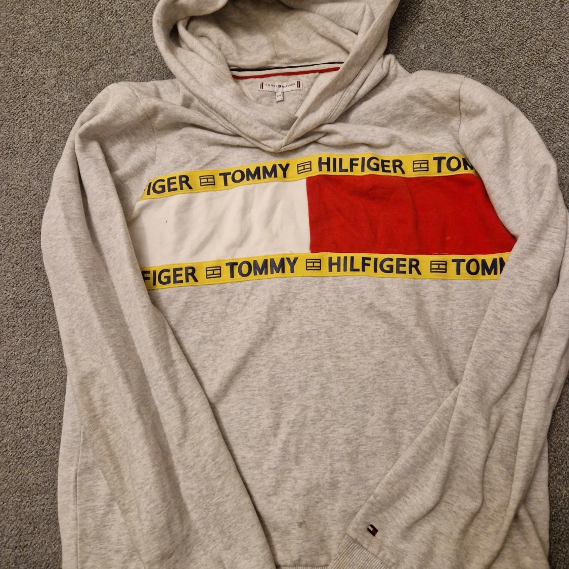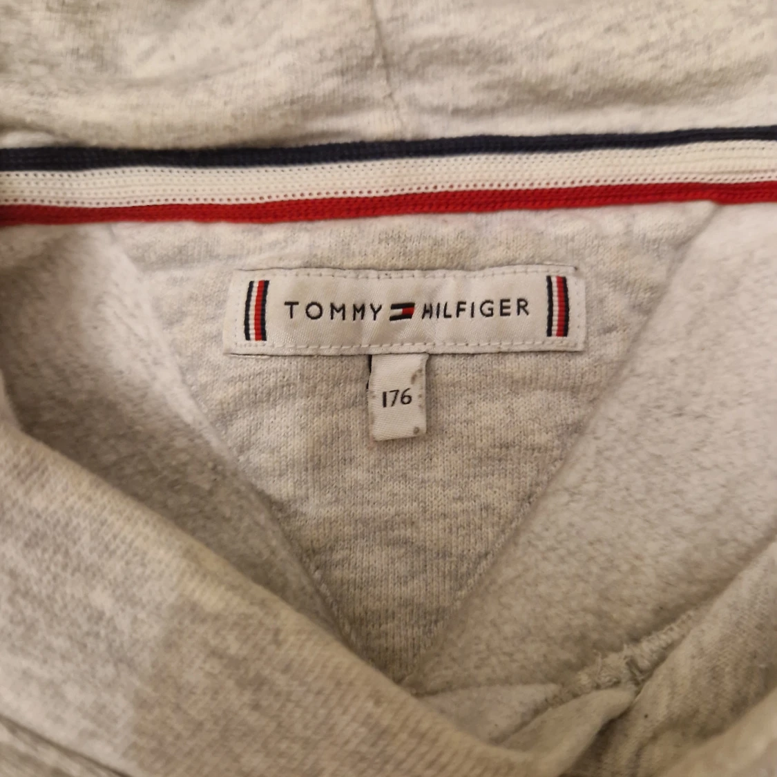 Säljer en stilren grå hoodie från Tommy Hilfiger med ett iögonfallande rött och vitt band över bröstet med märkets namn. Tröjan har långa ärmar och en klassisk huva. Perfekt för en avslappnad stil. 🧢