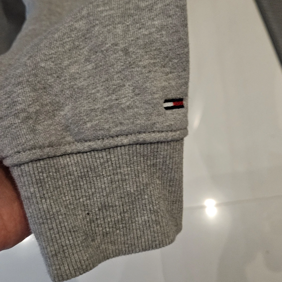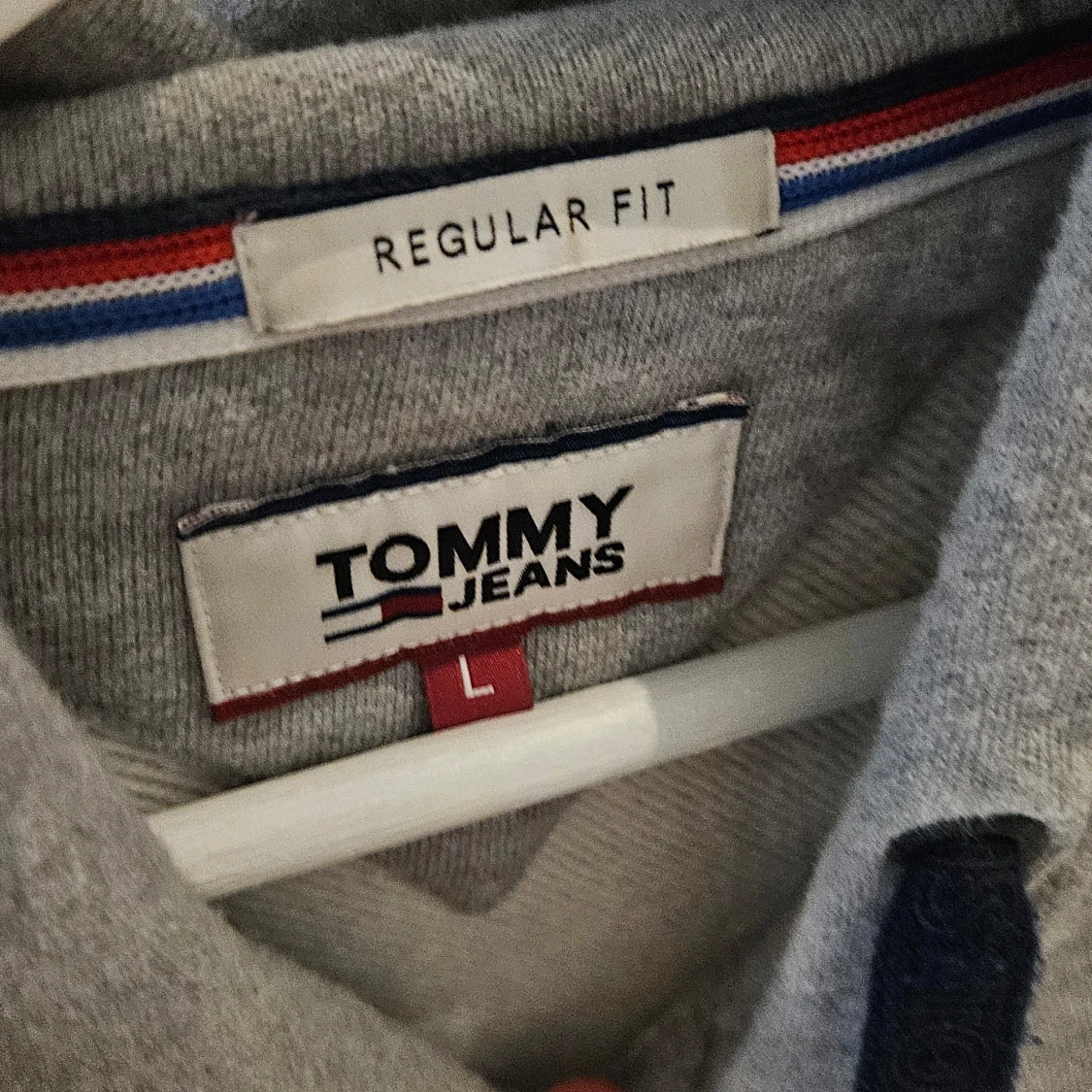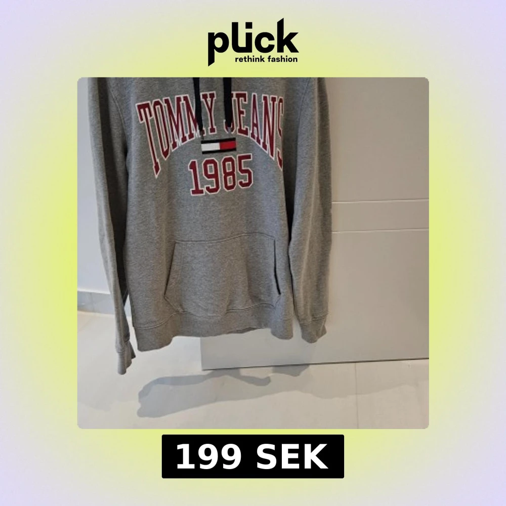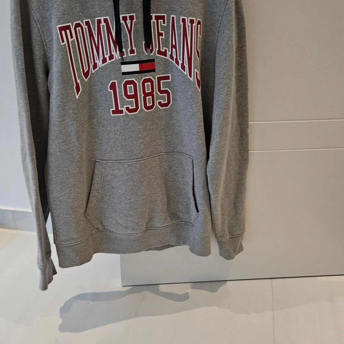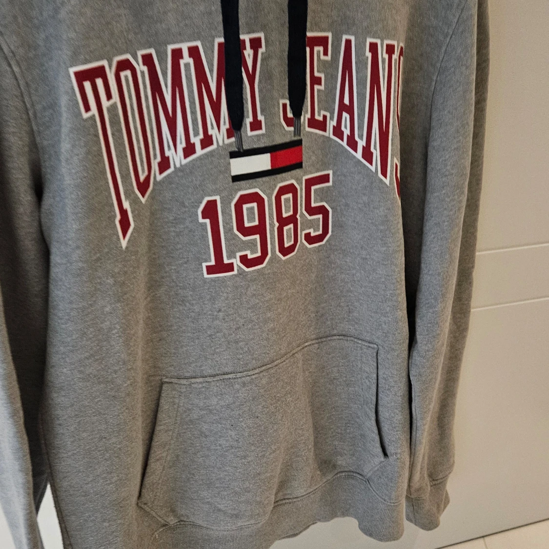 Säljer en grå hoodie från Tommy Jeans med texten '1985' i rött och vitt framtill. Den har en känguruficka och svarta snören vid huvan. Perfekt för en avslappnad stil.