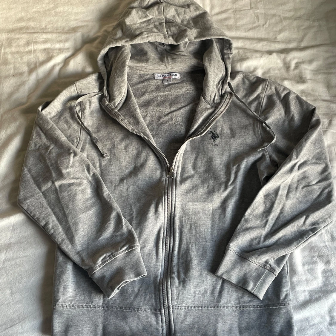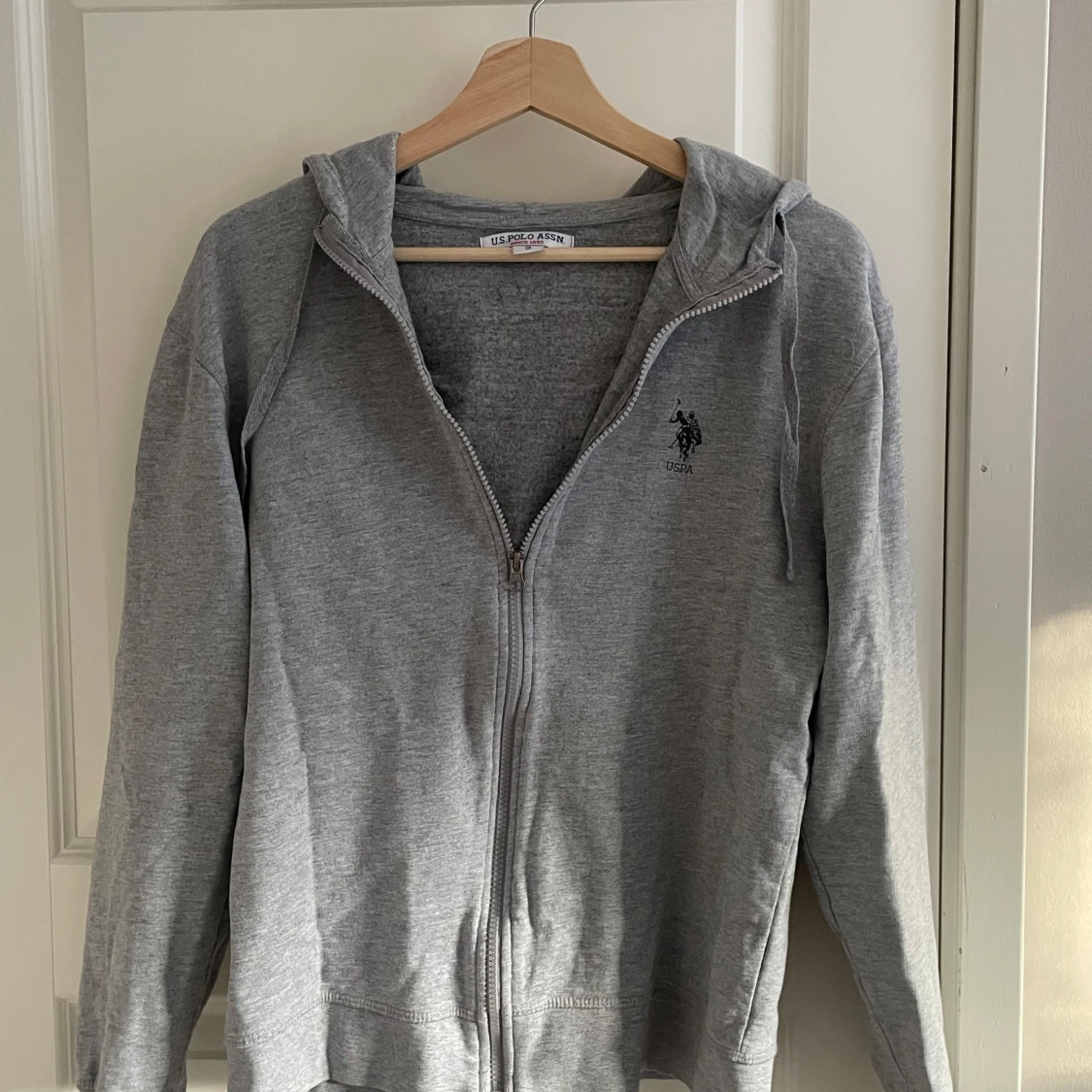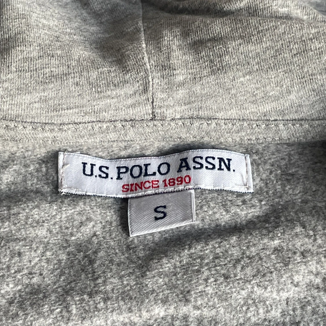Säljer en stilren grå hoodie från U.S. Polo Assn. med dragkedja och huva. Tröjan har ett diskret tryck av logotypen på bröstet och är tillverkad i mjukt material för extra komfort. Tröjan är i storlek S och har inga skador eller andra skavanker.