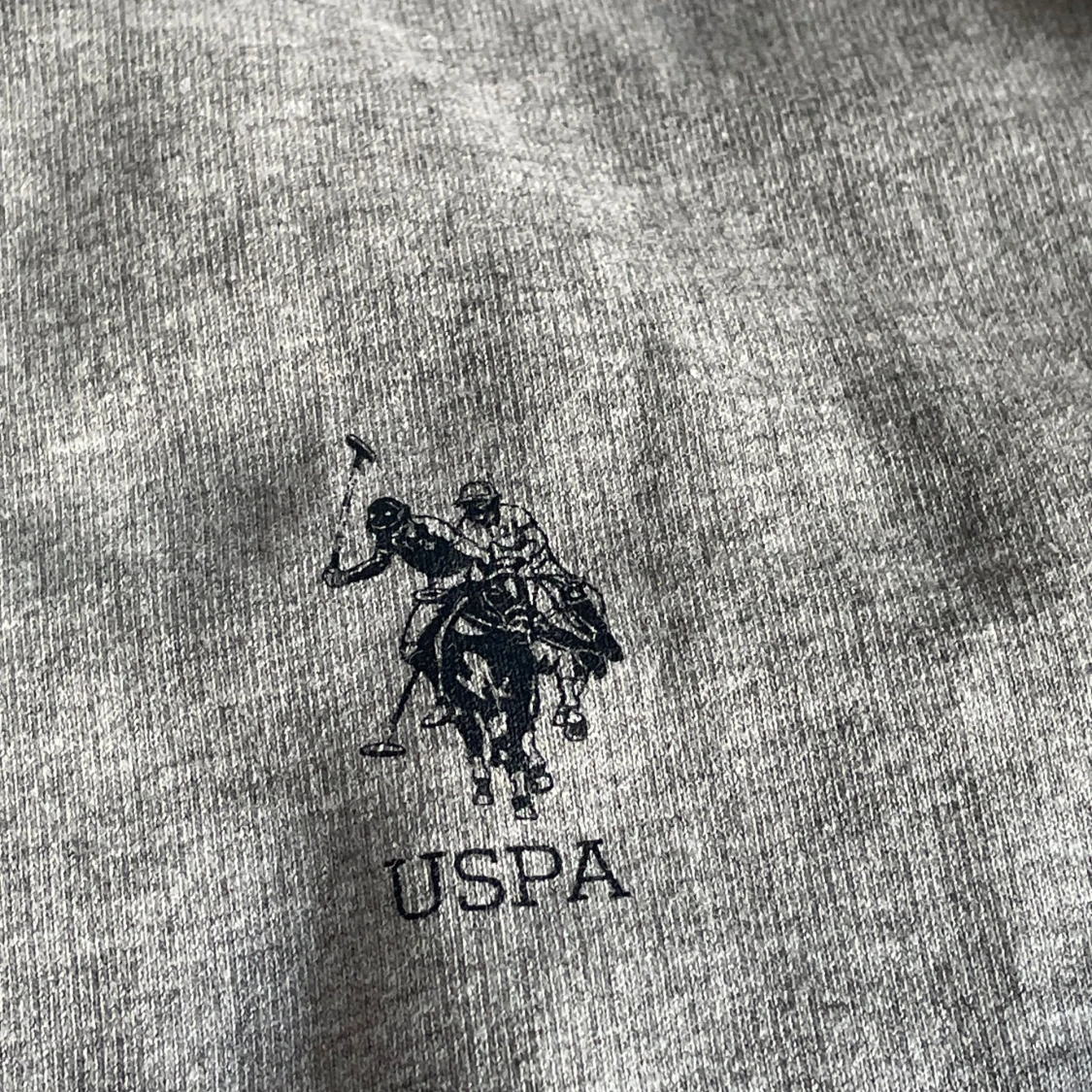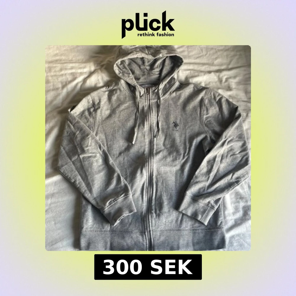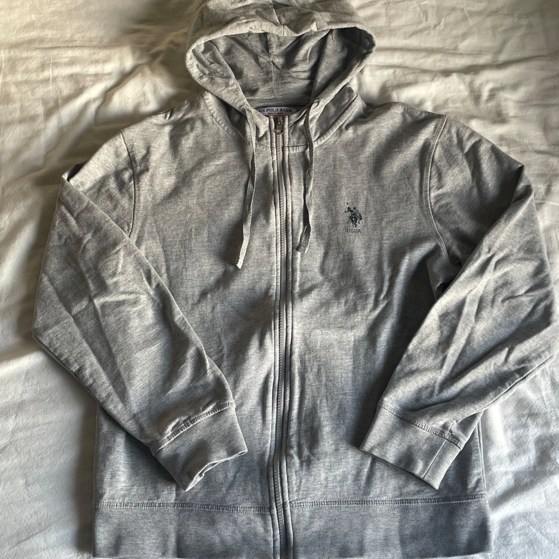 Säljer en stilren grå hoodie från U.S. Polo Assn. med dragkedja och huva. Tröjan har ett diskret tryck av logotypen på bröstet och är tillverkad i mjukt material för extra komfort. Tröjan är i storlek S och har inga skador eller andra skavanker.