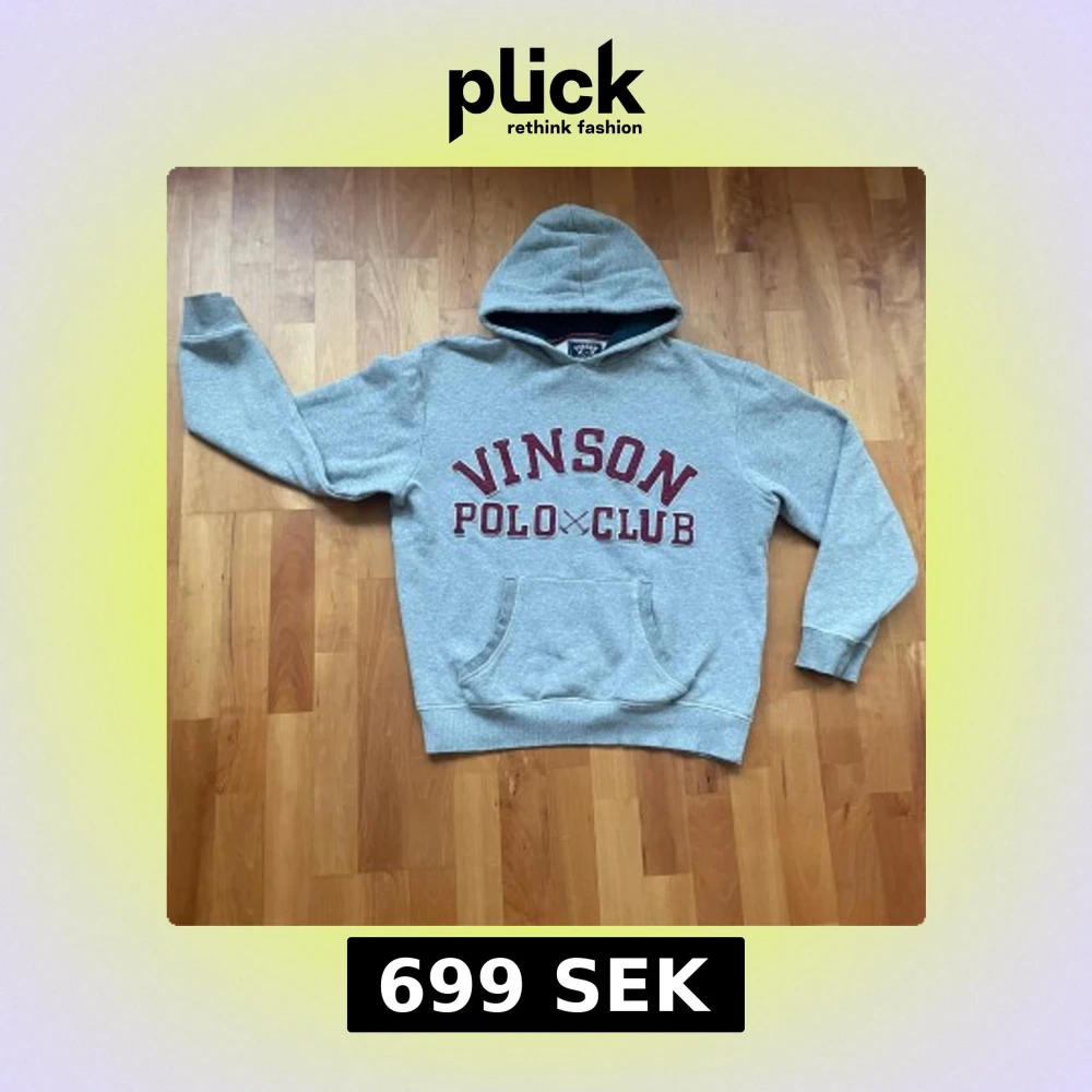 (LÄS ANNONS)!!! Säljer en grå hoodie från Vinson Polo Club med röd vintage text på framsidan. Tröjan har en klassisk ficka och en bekväm huva. Perfekt för en avslappnad stil. Storleken är M men passar också S (Den är alltså lite mindre i storlek!)
